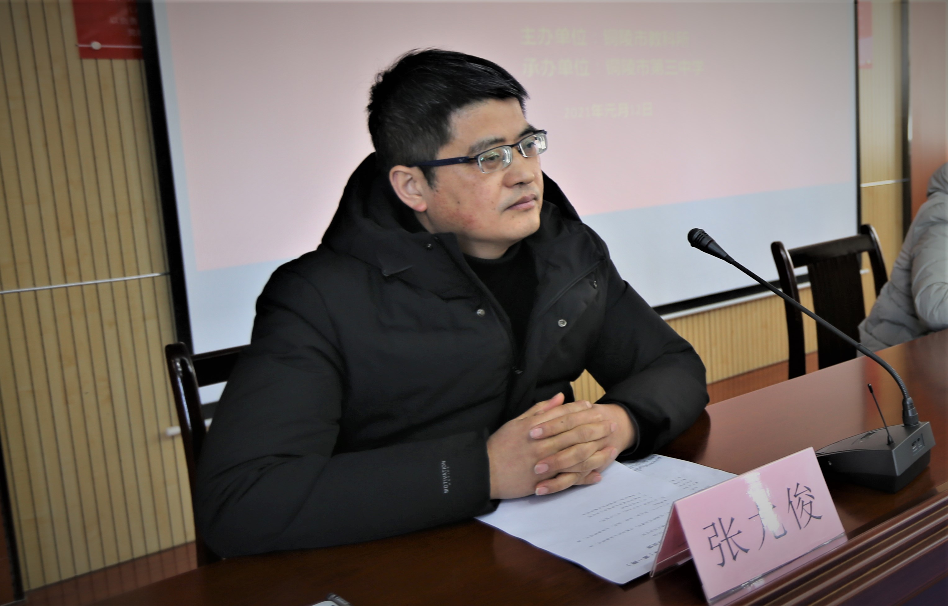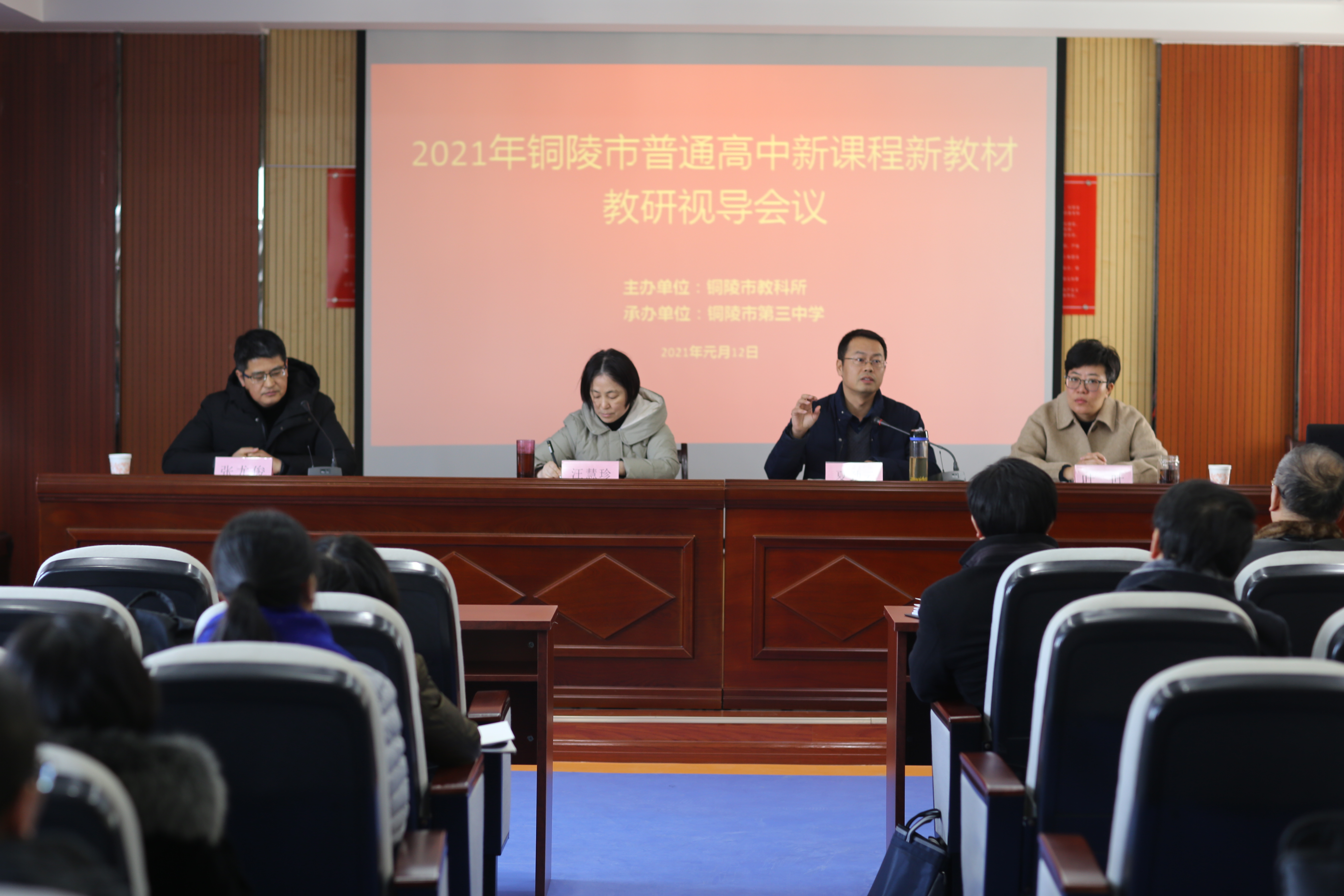 2021年新春伊始,市教科所就在酝酿着一场新课程新教材视导春潮。元月12日上午,市教科所在我校综合楼五楼会议室召开2021年铜陵市普通高中新课程新教材教学视导专家工作布置动员会。市教体局二级调研员汪慧珍、市教科所所长夏劲云、校党委副书记叶叶、校党委委员、副校长张尤俊、市各学科教研员和部分特邀专家与会,我校办公会成员、教研组长以及部分高一备课组长参加了本次会议。会议由张尤俊主持。