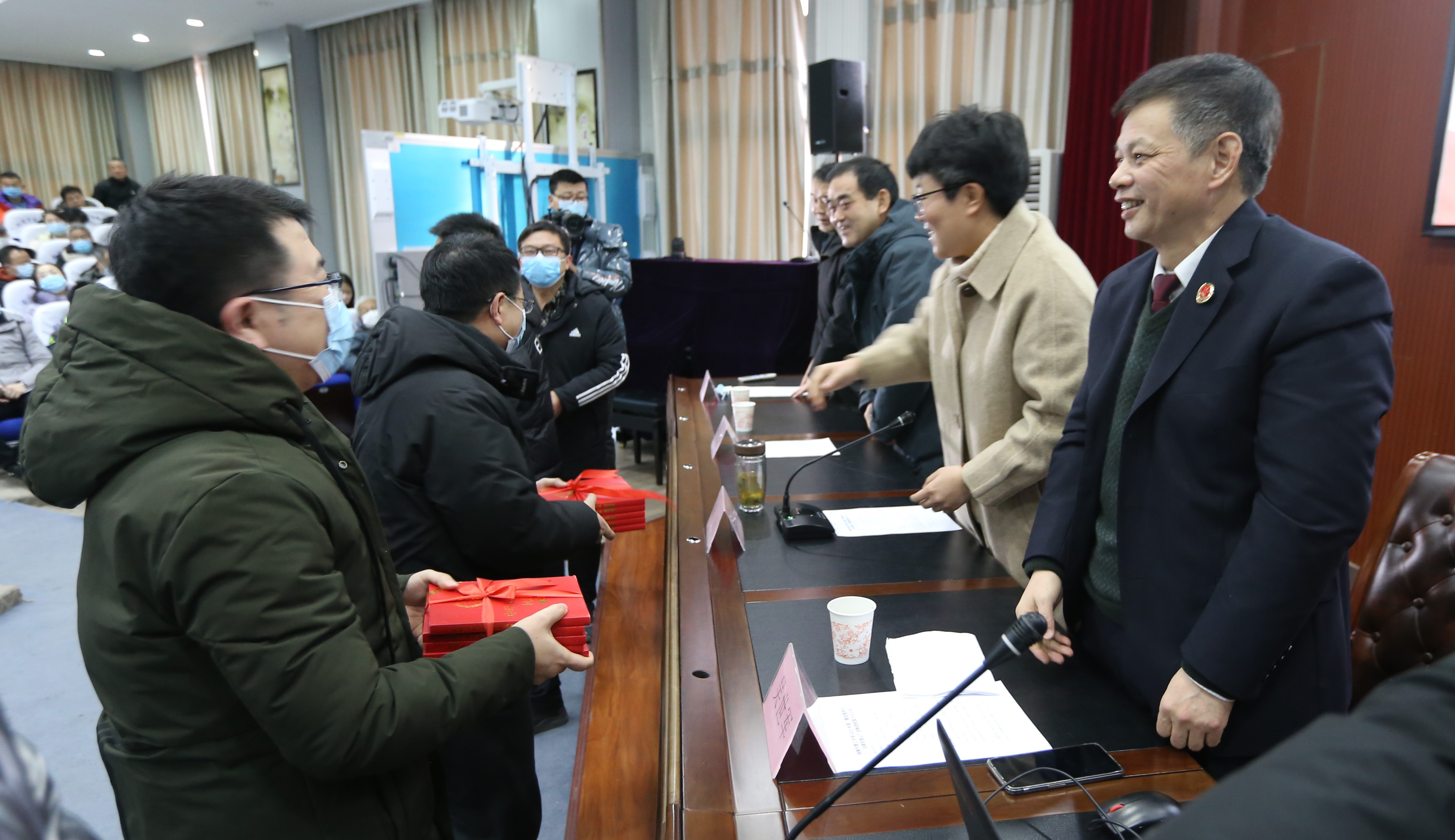 吴世军就法制进校园活动的重要意义讲话并和其它校领导一起向教师代表赠送《民法典》。