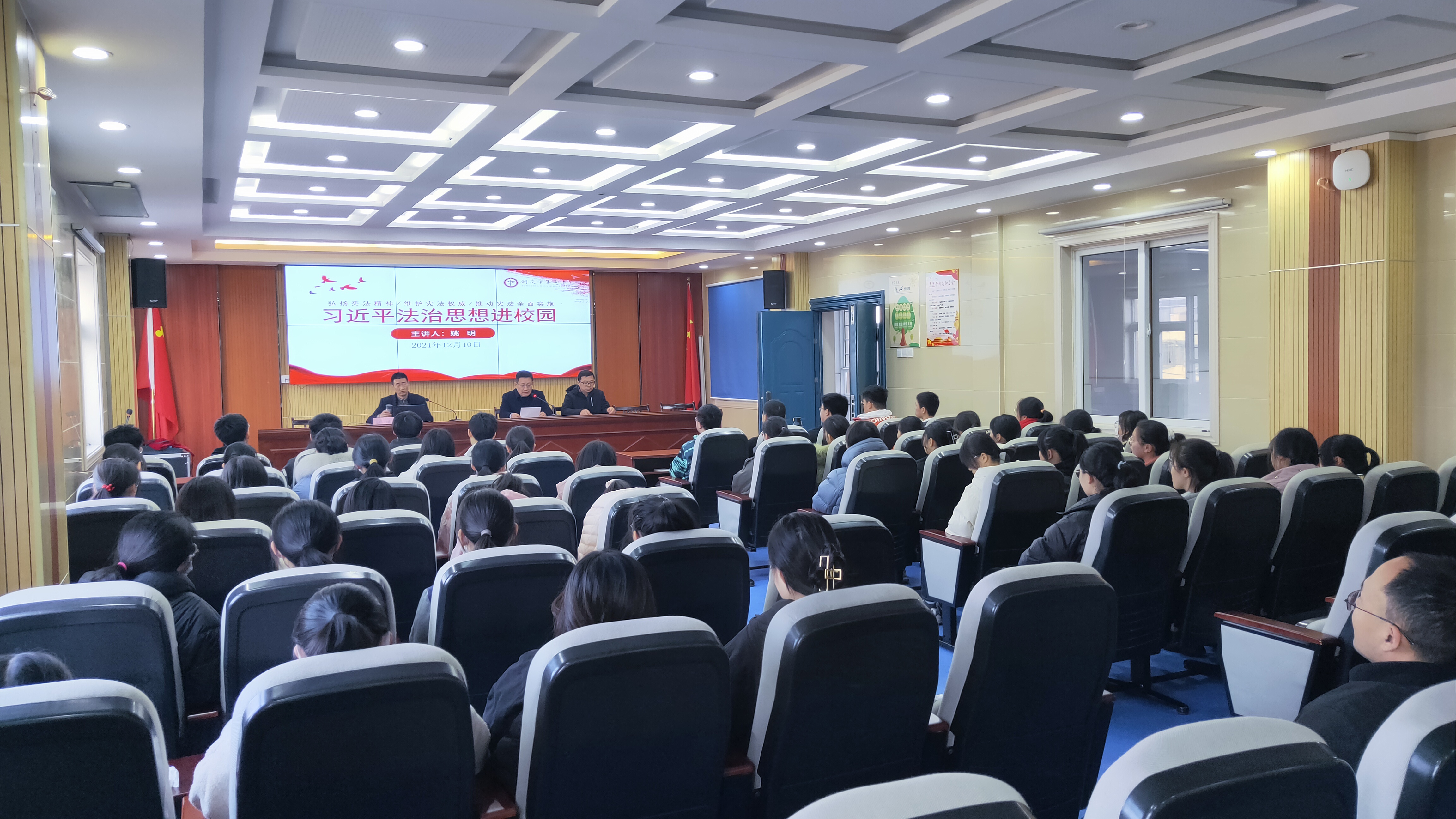 为推动习近平法治思想进学校,进课堂,进头脑,2021年12月10日下午,铜陵市教体局在我校举行“习近平法治思想进校园”讲座,邀请铜陵学院法学院副教授、法学博士姚明老师做《习近平法治思想及宪法学习心得与分享》讲座。校党委委员、副校长徐松成出席讲座并讲话,市教体局法规科吴平老师出席讲座,校保卫科负责人凌兴民主持讲座,校保卫科乔红胜、姚辉老师参加讲座。