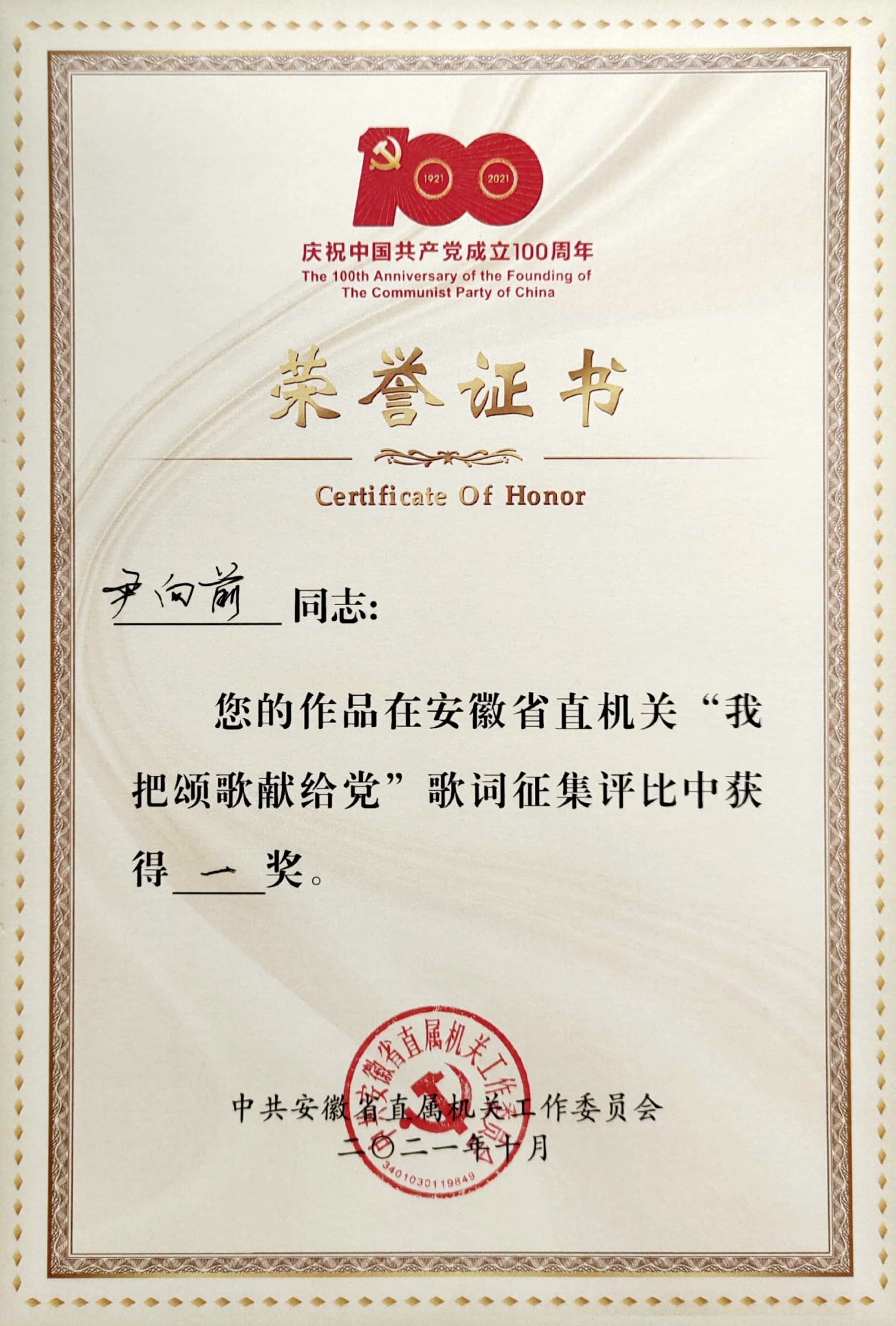 近日,中共安徽省直机关工委公布安徽省“我把歌词献给党”歌词征集评比活动结果,我校尹向前老师代表铜陵市直机关工委参赛的作品《倾诉》荣获省级一等奖。