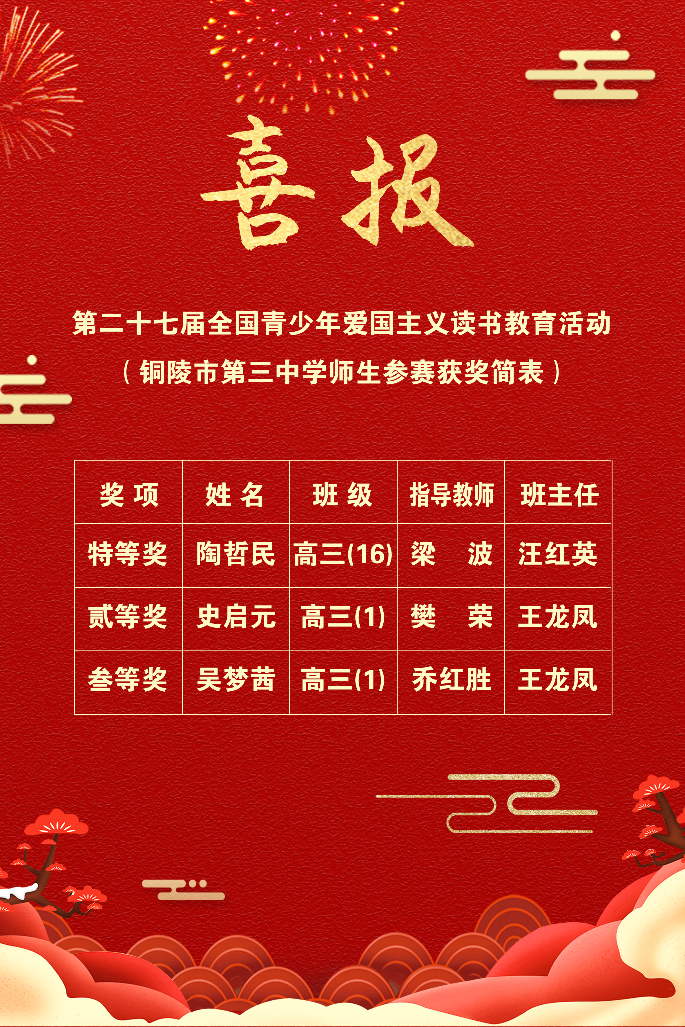 与此同时,高三(1)班史启元同学荣获第二十七届全国青少年爱国主义读书教育活动中贰等奖;高三(1)班吴梦茜同学荣获第二十七届全国青少年爱国主义读书教育活动中叁等奖。参赛过程中,得到樊荣老师、乔红胜老师和王龙凤老师的悉心指导。在一个班级里,脱颖而出两位全国青少年爱国主义读书教育活动优秀学生,在我校实属首例,更折射出我校积极进取的班级文化氛围。史启元同学是班级的团支部书记,团结同学,关心集体,曾荣获:第二十六届全国青少年爱国主义读书教育活动贰等奖、全国第二届中华经典诵写讲大赛“经典诵读”安徽省赛区一等奖、安徽省“学宪法,讲宪法”演讲比赛三等奖、安徽省青少年科技创新比赛三等奖。在2021届省传媒专业考试中,取得全省第七名的优异成绩,这是自安徽省2016年开展模块一,播音与主持艺术省考以来,铜陵市取得过的最好成绩!吴梦茜同学为人谦逊,性格开朗,学习勤奋,多次在征文比赛中摘金夺银。担任班级的政治课代表,是老师的好帮手、同学的好伙伴。