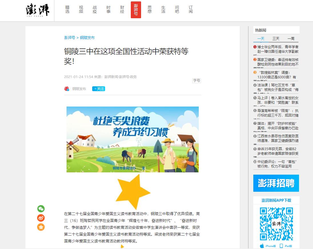 澎湃新闻:铜陵三中在这项全国性活动中荣获特等奖!