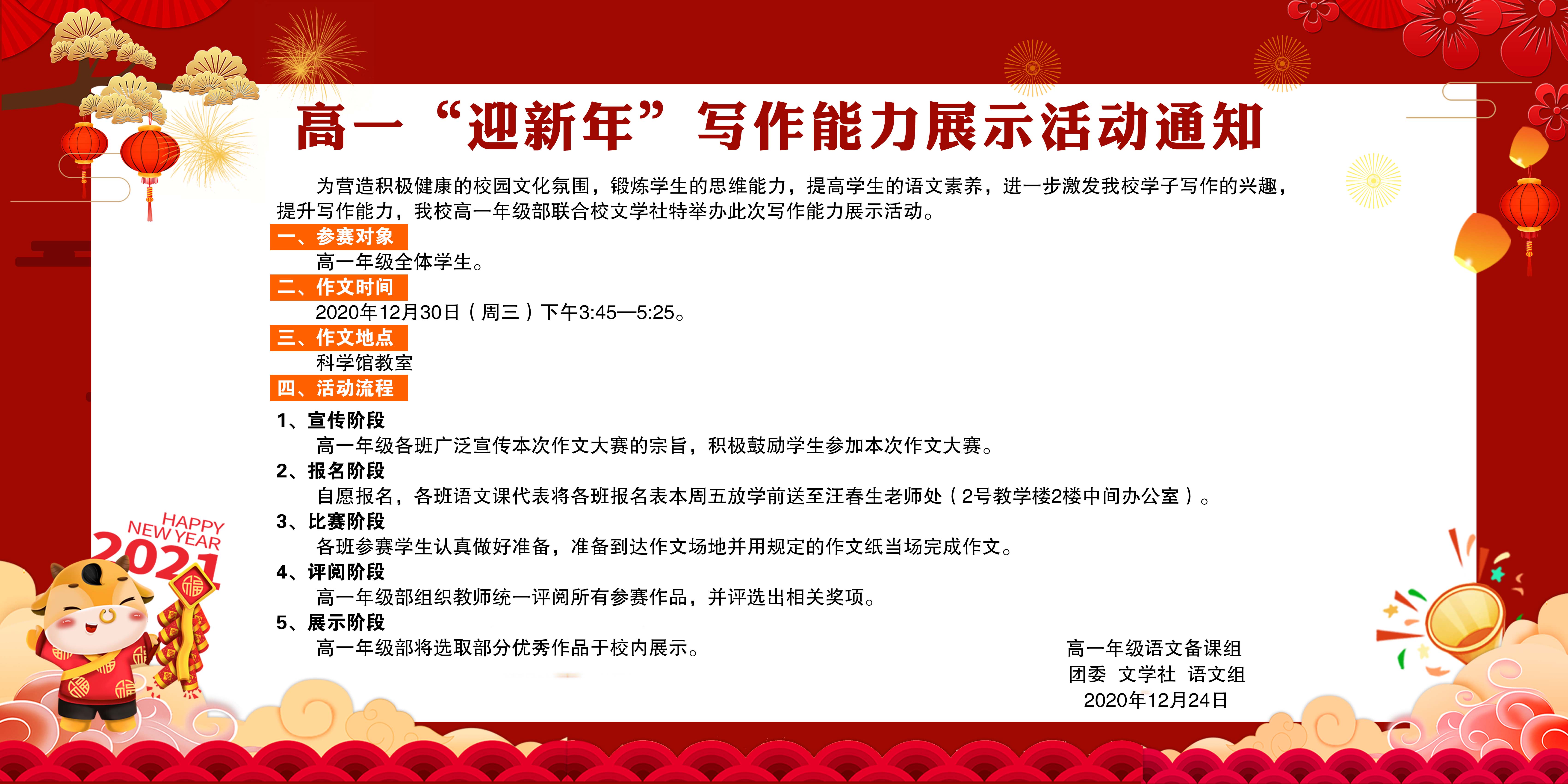 为进一步激发我校学子写作的兴趣,提升写作能力,我校语文组与高一年级部、校团委、文学社联合举行“‘迎新年’写作能力展示活动”。