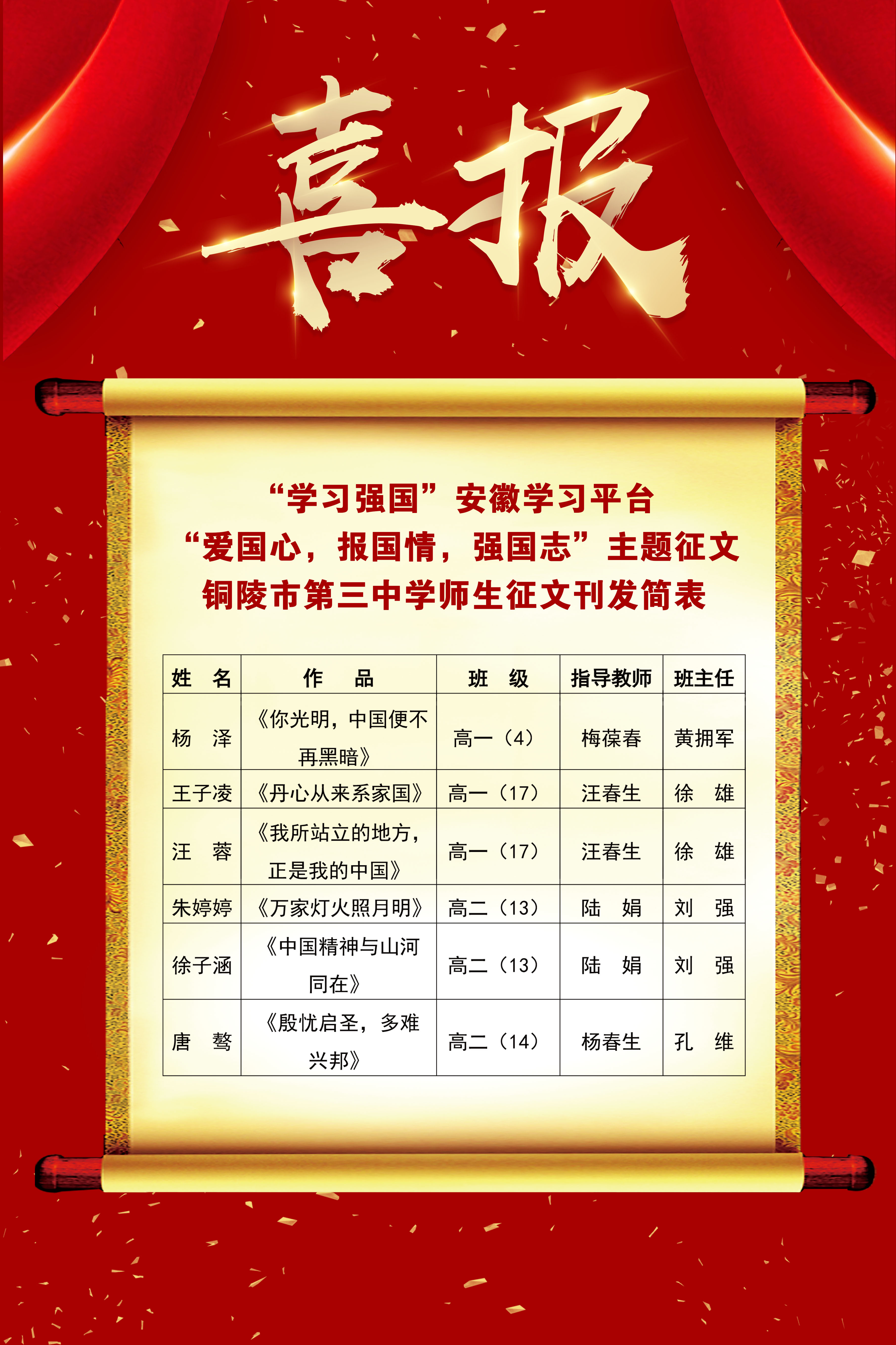 “爱国心,报国情,强国志”主题征文活动由中共安徽省委宣传部和中共安徽省委教育工作委员会联合主办,承办单位是“学习强国”安徽学习平台。活动旨在培育社会主义核心价值观,让爱国主义精神在青少年心中牢牢扎根,激励青少年学生志存高远、脚踏实地,争做时代新人。铜陵市第三中学党委积极贯彻活动精神,引导青少年学生涵养家国情怀,坚定四个自信。学校生态文化科普中心具体落实,组织开展学生征文评比,并及时报送优秀作品给市教体局宣教科,累计6篇优秀作品发表上“学习强国”平台上,充分展示了我校师生奋发有为的校园文化氛围。