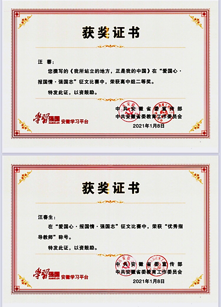 其中,我校高一(17)班汪蓉同学的作品《我所站立的地方,正是我的中国》荣获高中组征文省赛二等奖,汪春生教师荣获“优秀指导教师”称号。