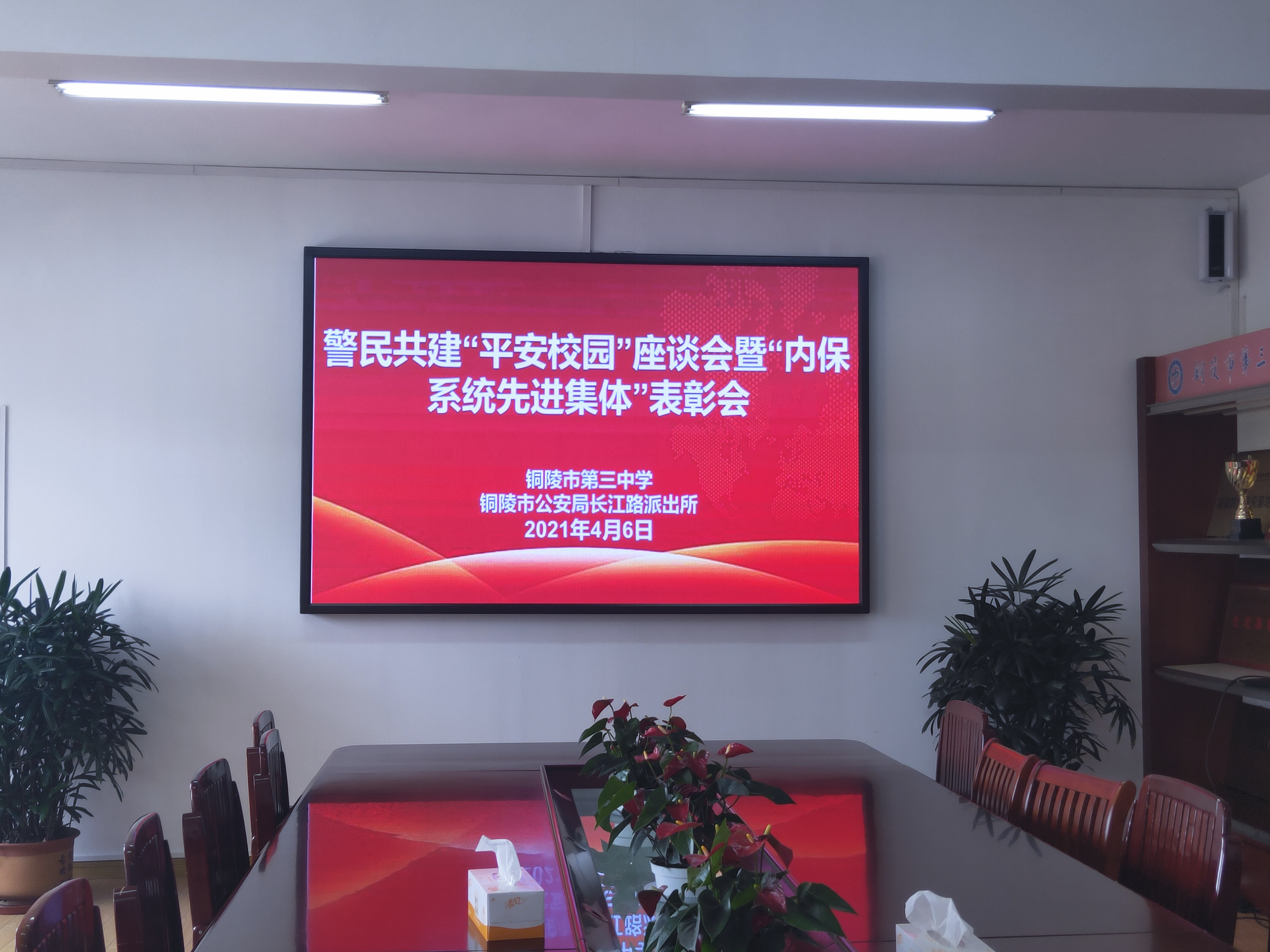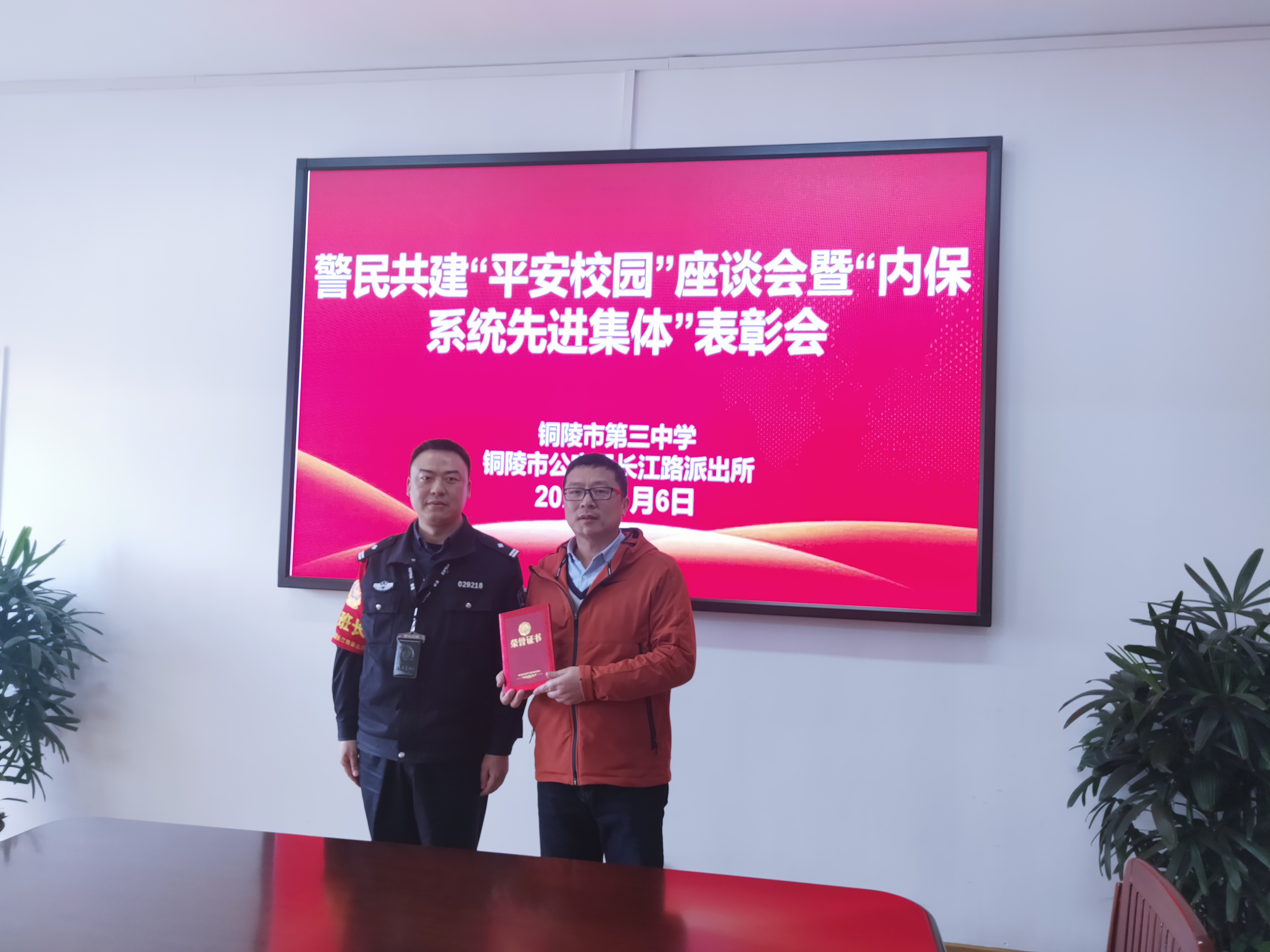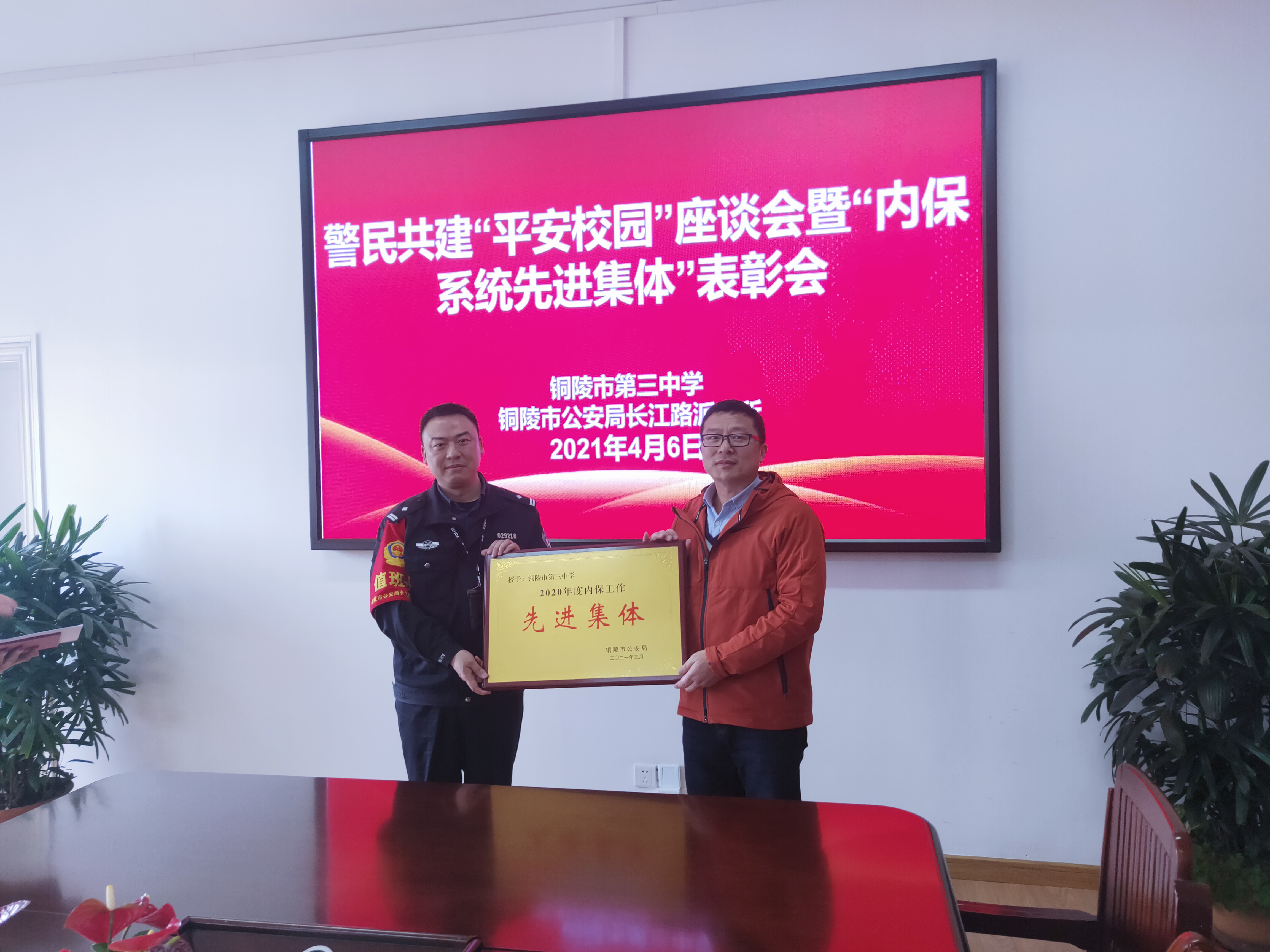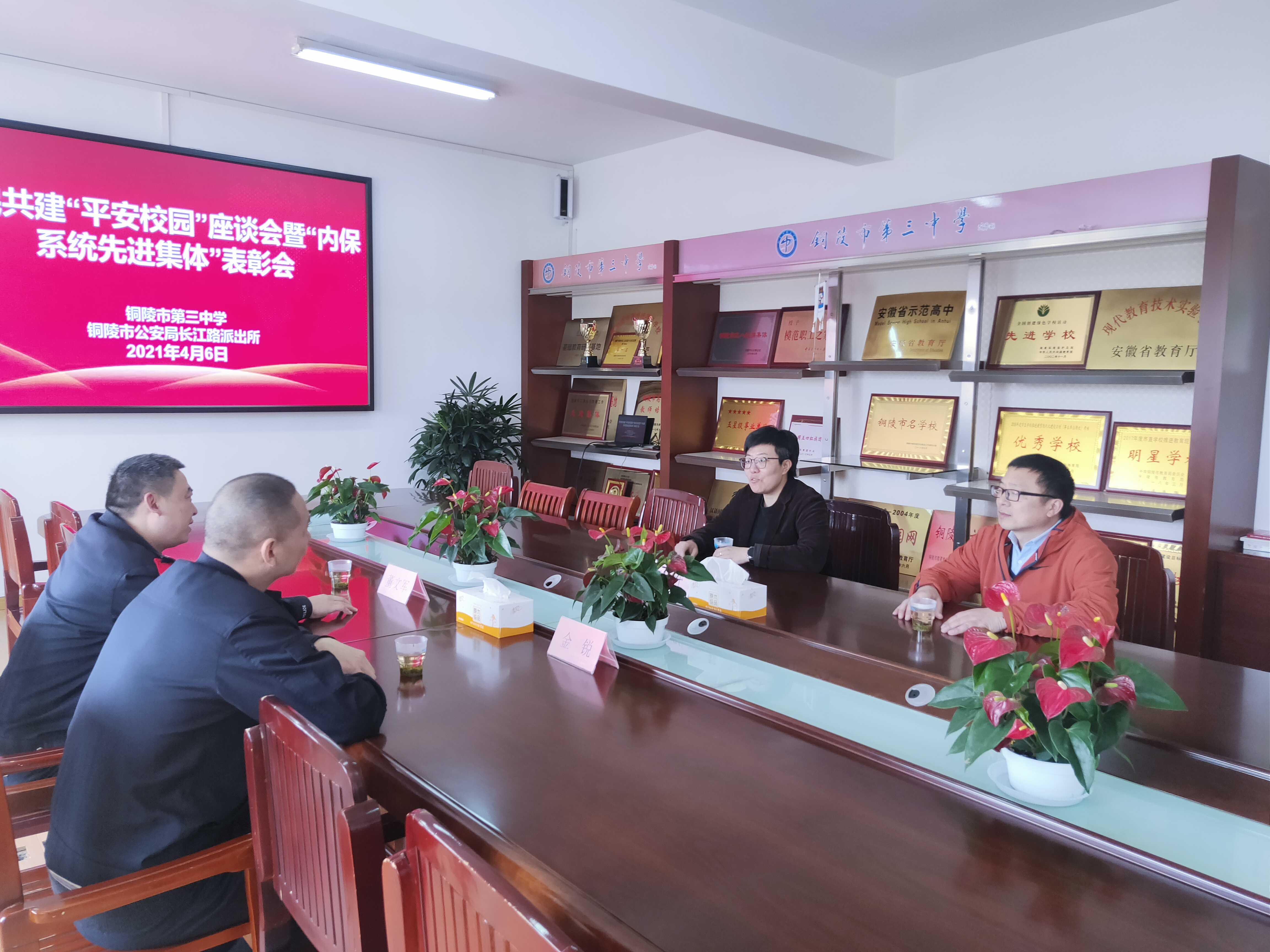 为进一步加强警校合作交流,2021年4月6日下午,铜陵市第三中学与铜陵市长江路派出所警民共建平安校园座谈会暨内保系统先进集体表彰会在我校行政楼五楼会议室召开。铜陵市公安局长江路派出所所长董文军、驻社区民警金锐,铜陵市第三中学党委副书记叶叶、保卫科负责人凌兴民、保卫科乔红胜老师等参加座谈会。