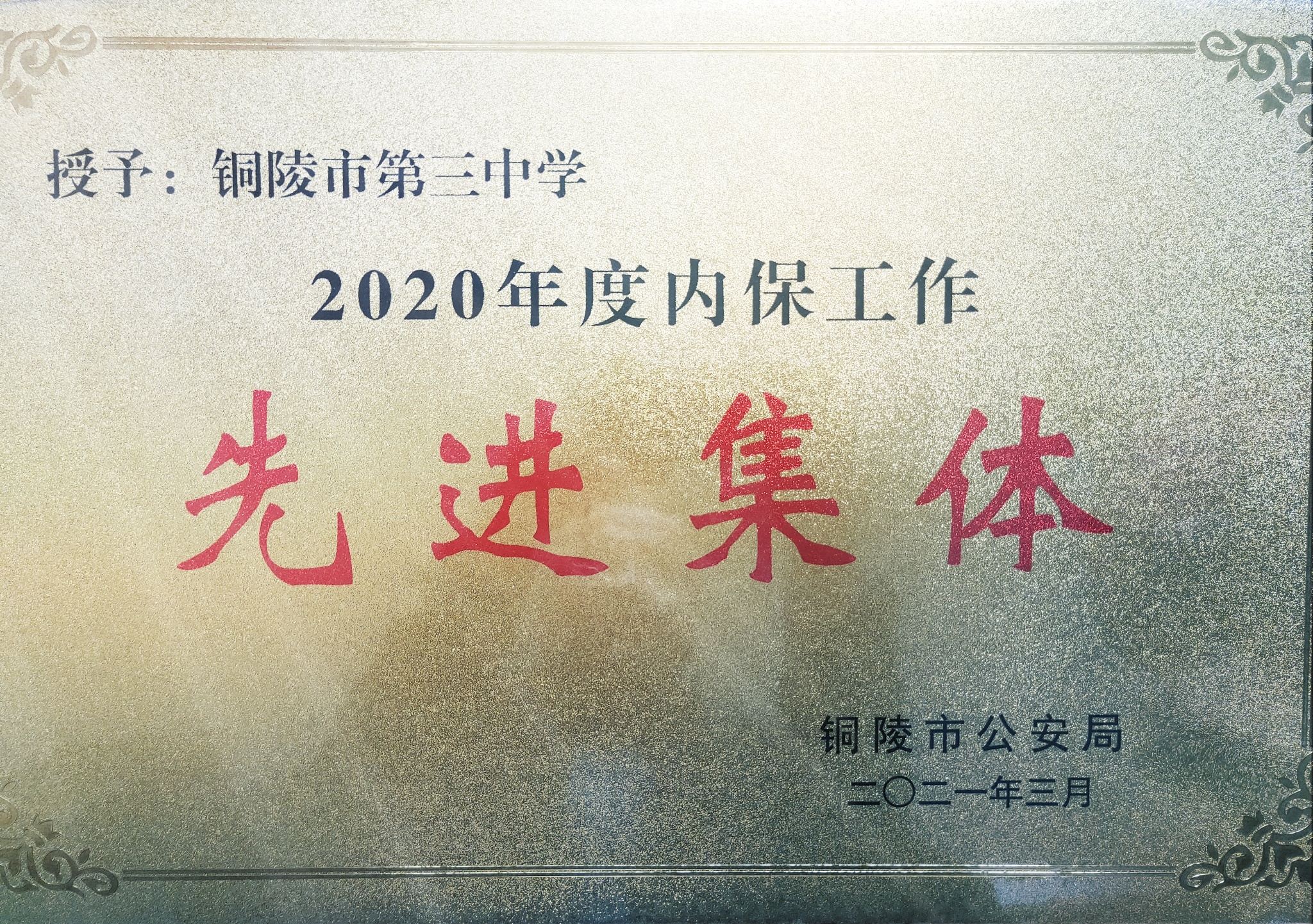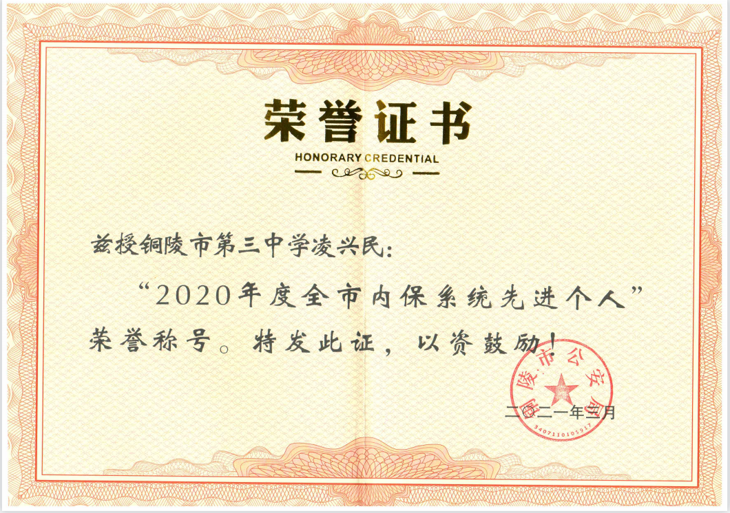 座谈会后,董所长代表铜陵市公安局向我校颁发了全市内保系统先进集体和先进个人的奖牌和证书。据悉,本次我校获得铜陵市公安局授予的2020年度全市内保系统先进集体,凌兴民同志获得2020年度全市内保系统先进个人。同时获得先进集体和先进个人两项荣誉称号,这不仅在我市教体系统中为唯一,在全市范围内也屈指可数。