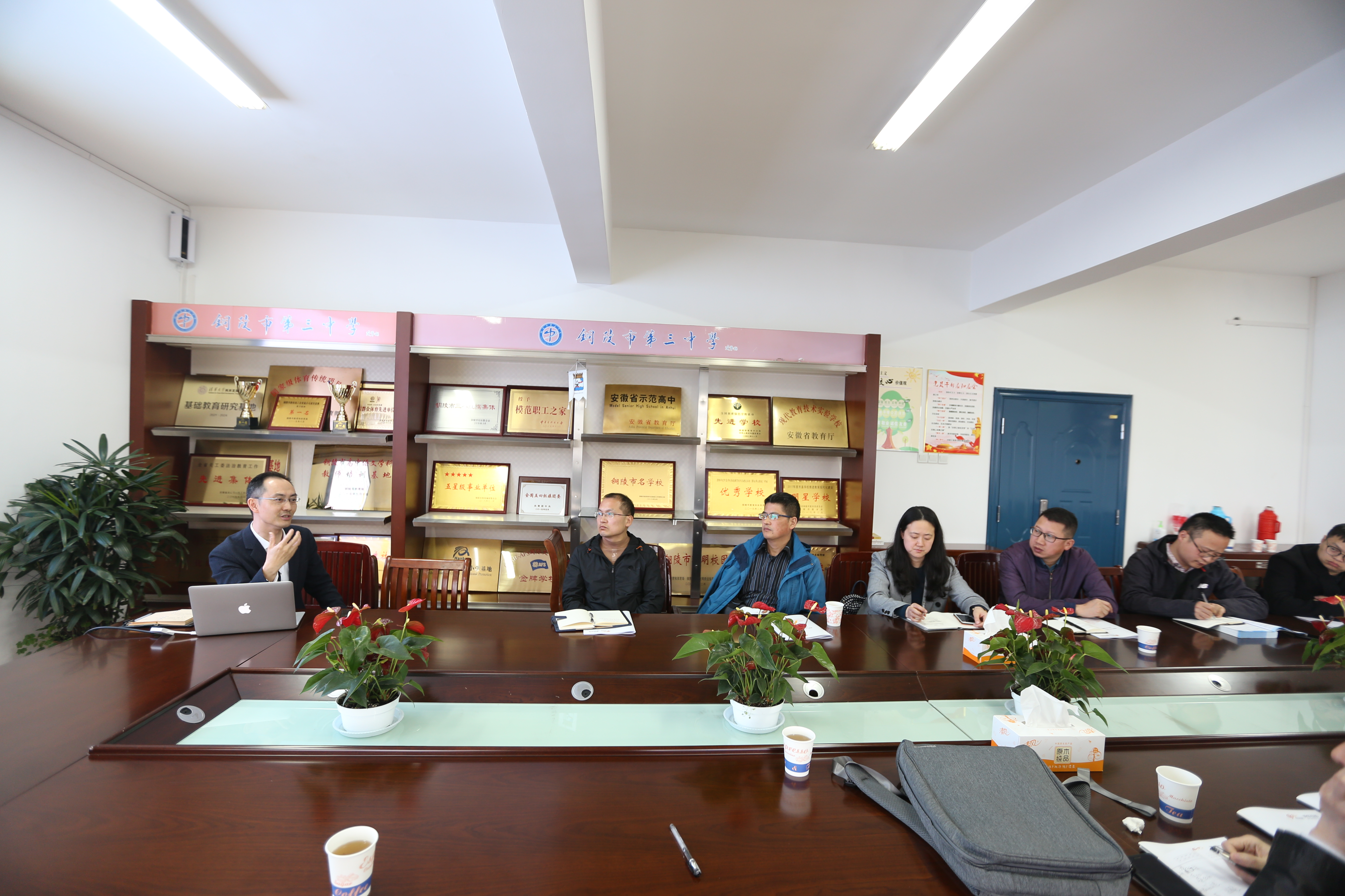 本校讯 4月7号下午,我校合作伙伴清华大学卓尔教育专家组成员,全国著名信息技术学金牌教练江涛老师来校交流指导,清华大学卓尔教育基础教育事业部总裁潘丰,校党委委员、副校长张尤俊,教务主任徐盼和校信息技术学科教师参加交流指导会。