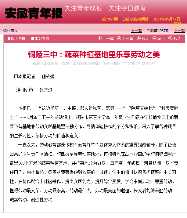 本报讯 “这边是茄子、生菜,那边是秋葵、莴笋……”“除草交给我”“我负责翻土”……4月29日下午的活动课上,铜陵市第三中学高一年级学生们正在学校植物园里的蔬菜科普基地兼劳动实践基地里辛勤劳作,尽情体验耕作的辛劳和快乐,深入了解各种蔬果的生长习性,领悟劳动的价值和意义。
