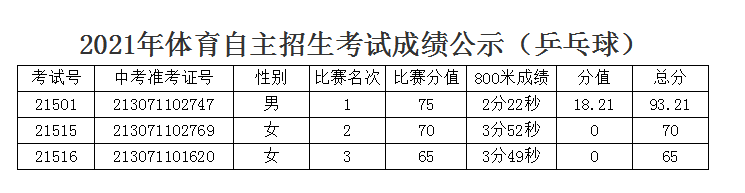 在市教体局领导的关心指导下,我校2021年体育自主招生考试(乒乓球)已于2021年6月27日顺利完成,现将成绩公示如下。如有异议,请于2021年6月30日前与铜陵市第三中学教务处联系。
