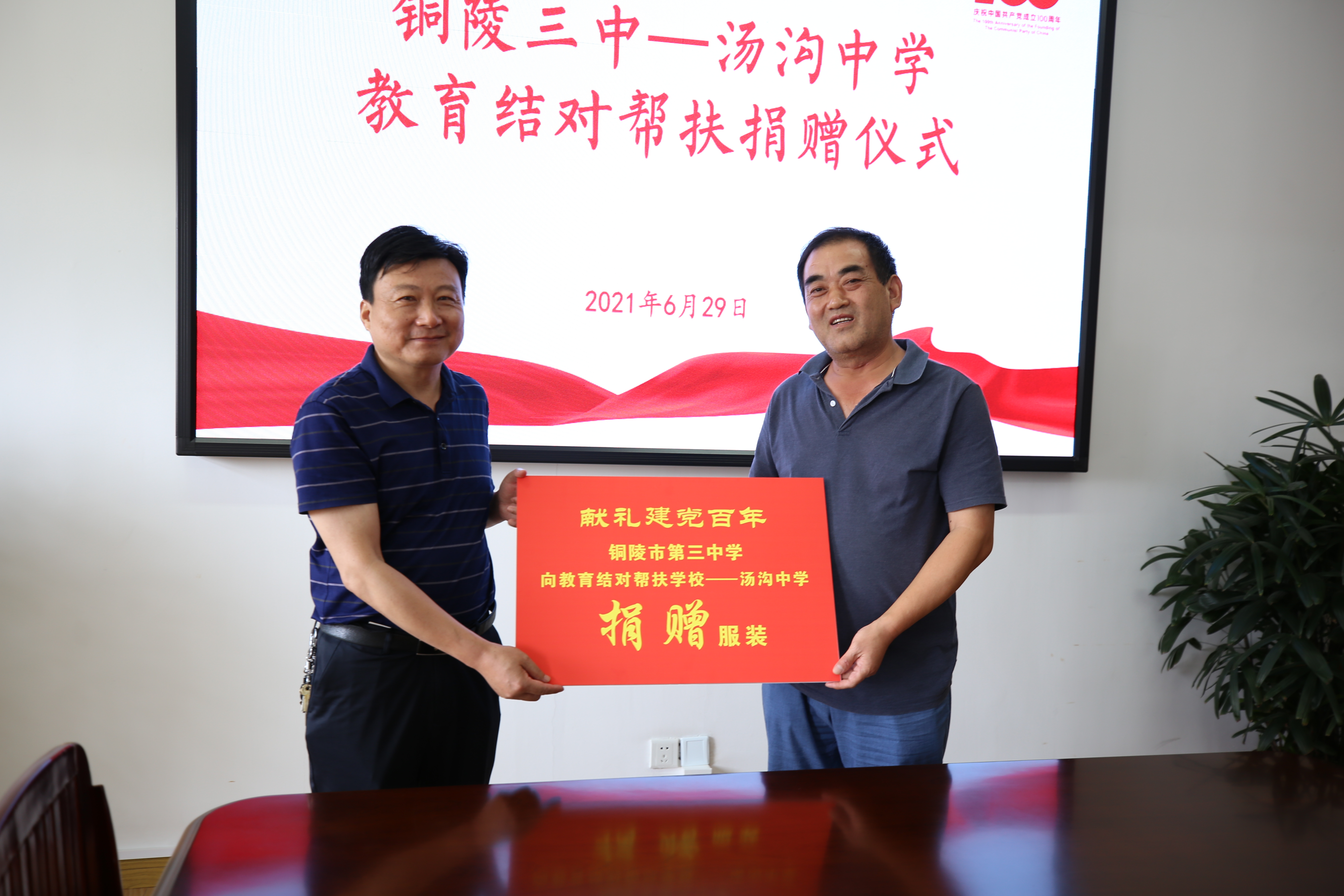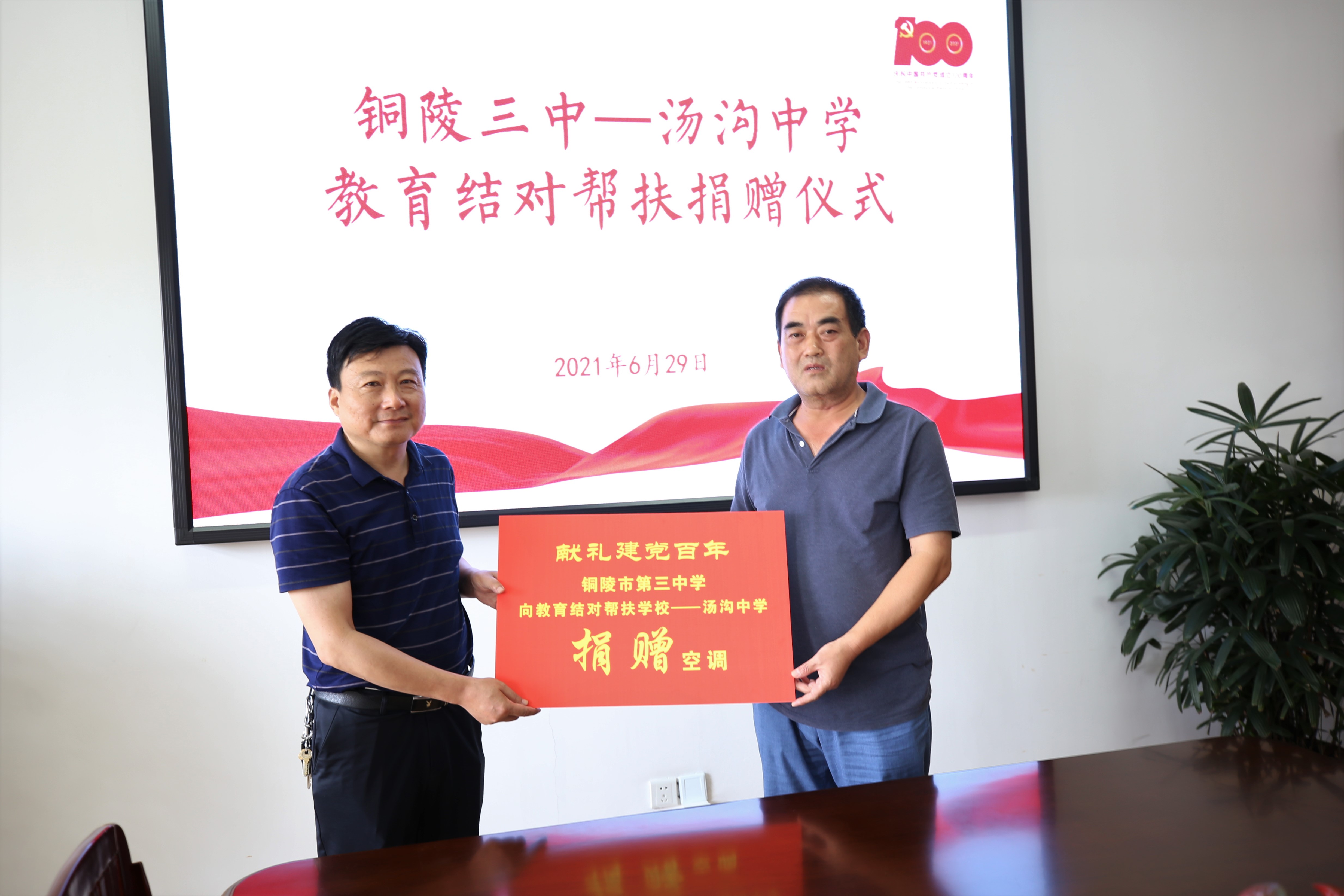 本校讯 献礼建党百年,暖红永驻心中。6月29日上午,我校捐赠结对帮扶学校汤沟中学仪式在铜陵三中举行,我校党委委员、副校长张国荣,汤沟中学党支部书记、校长徐国,我校党委委员、副校长张尤俊,汤沟中学副校长祖学进,汤沟中学钱汪洋主任,疏得权主任,我校梁波主任、江选安副主任参加捐赠仪式。