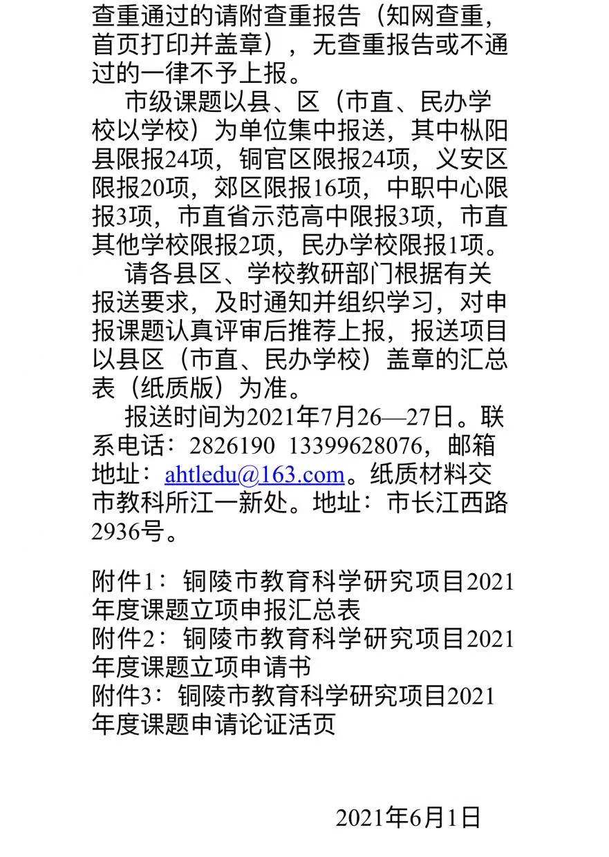 关于铜陵市教育科学研究项目2021年度课题申报工作的通知