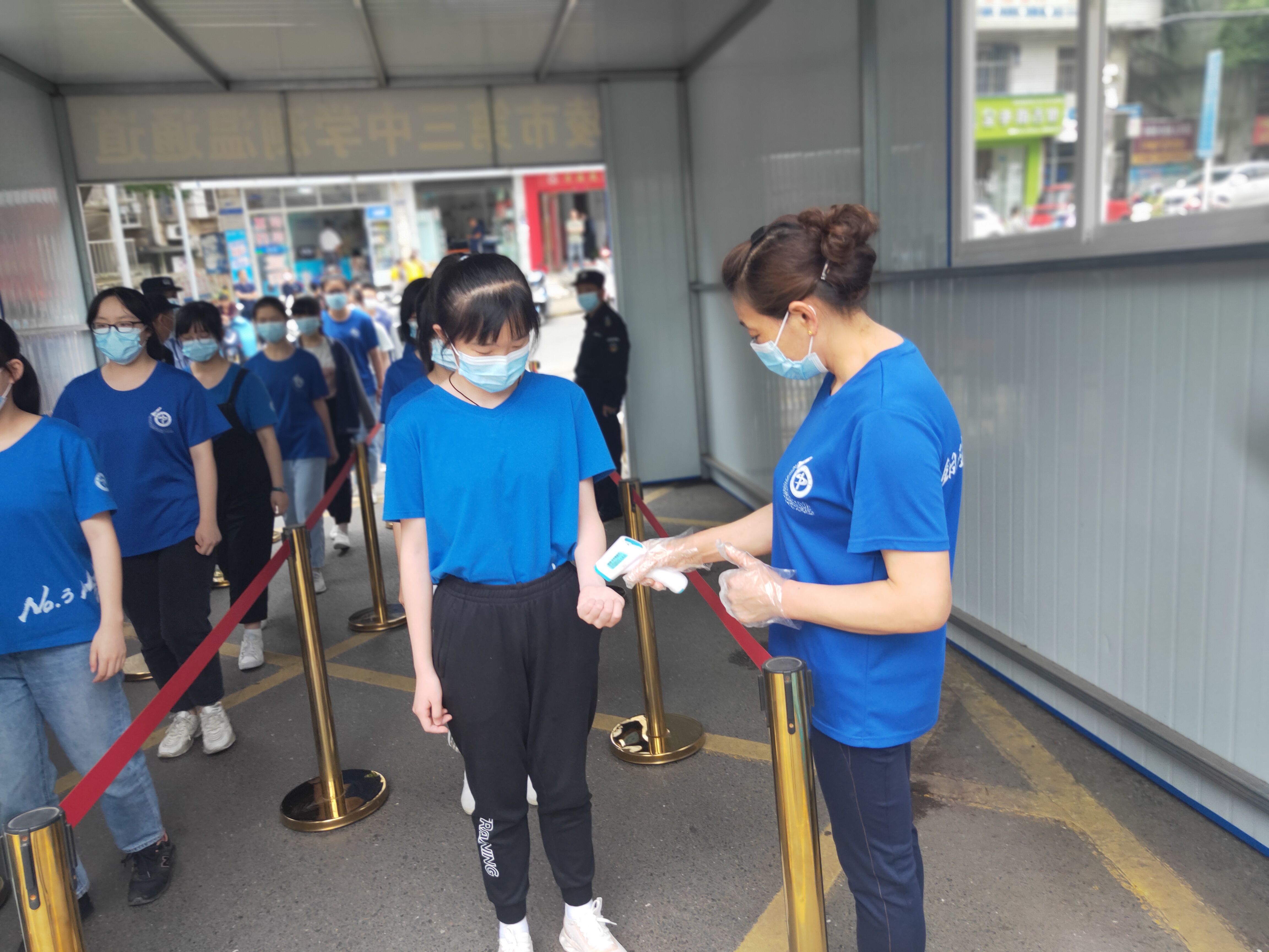 场景3:体温补测异常考生,由工作人员引导至二次测温区域,用水银温度计进行腋下复测,体温正常者正常入场,确实发热者由防疫医疗副主考会同考点主考共同研判决定,是否启用备用隔离考场。