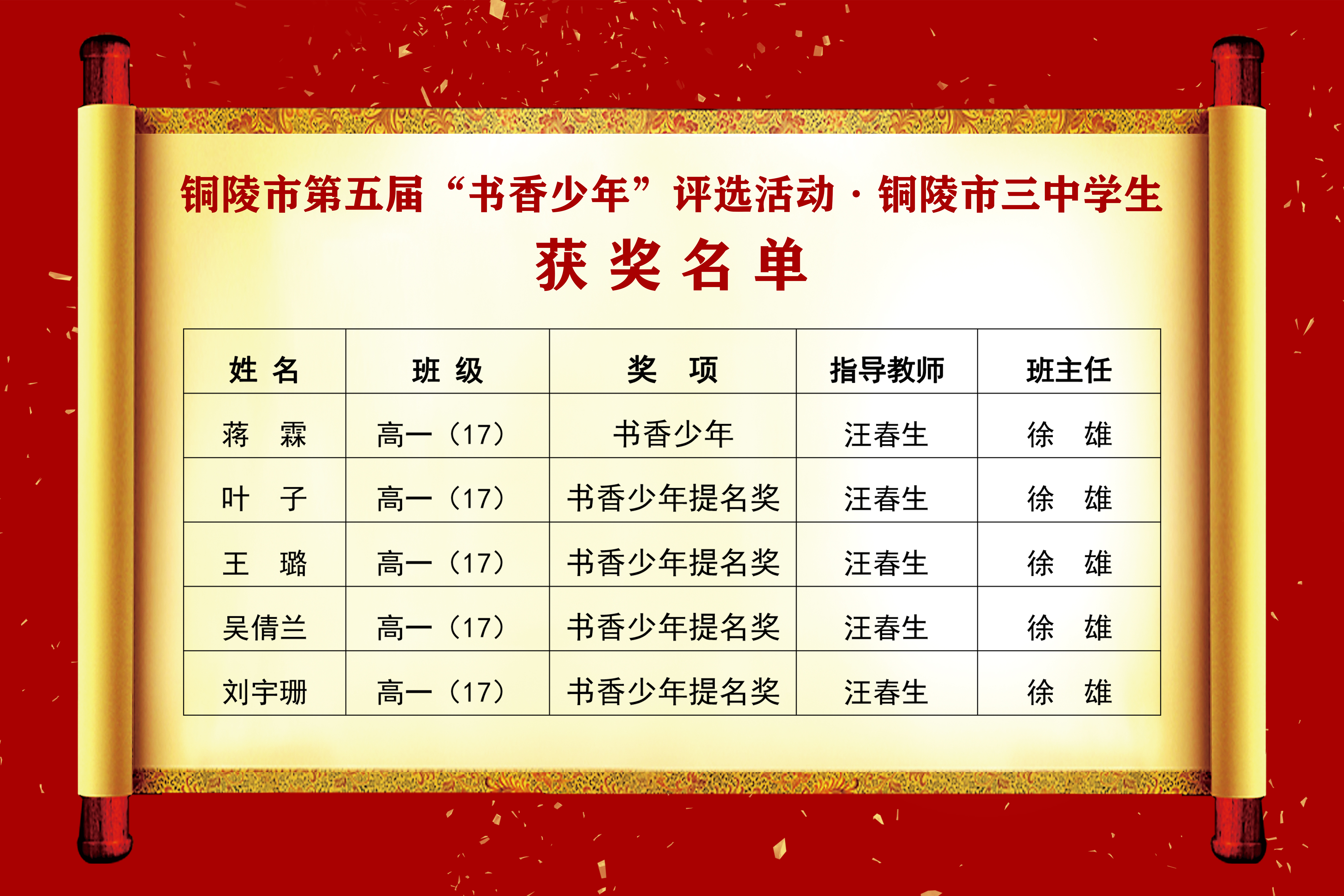 为进一步培育和践行社会主义核心价值观教育,引导广大青少年多读书、会读书、爱读书,铜陵市教体局关工委开展了第五届“书香少年”评选活动。活动要求参选学生自选书目,图书内容要积极有为,健康向上,符合时代主题和社会主义核心价值观;以经典文学读物为主,撰写读后感。