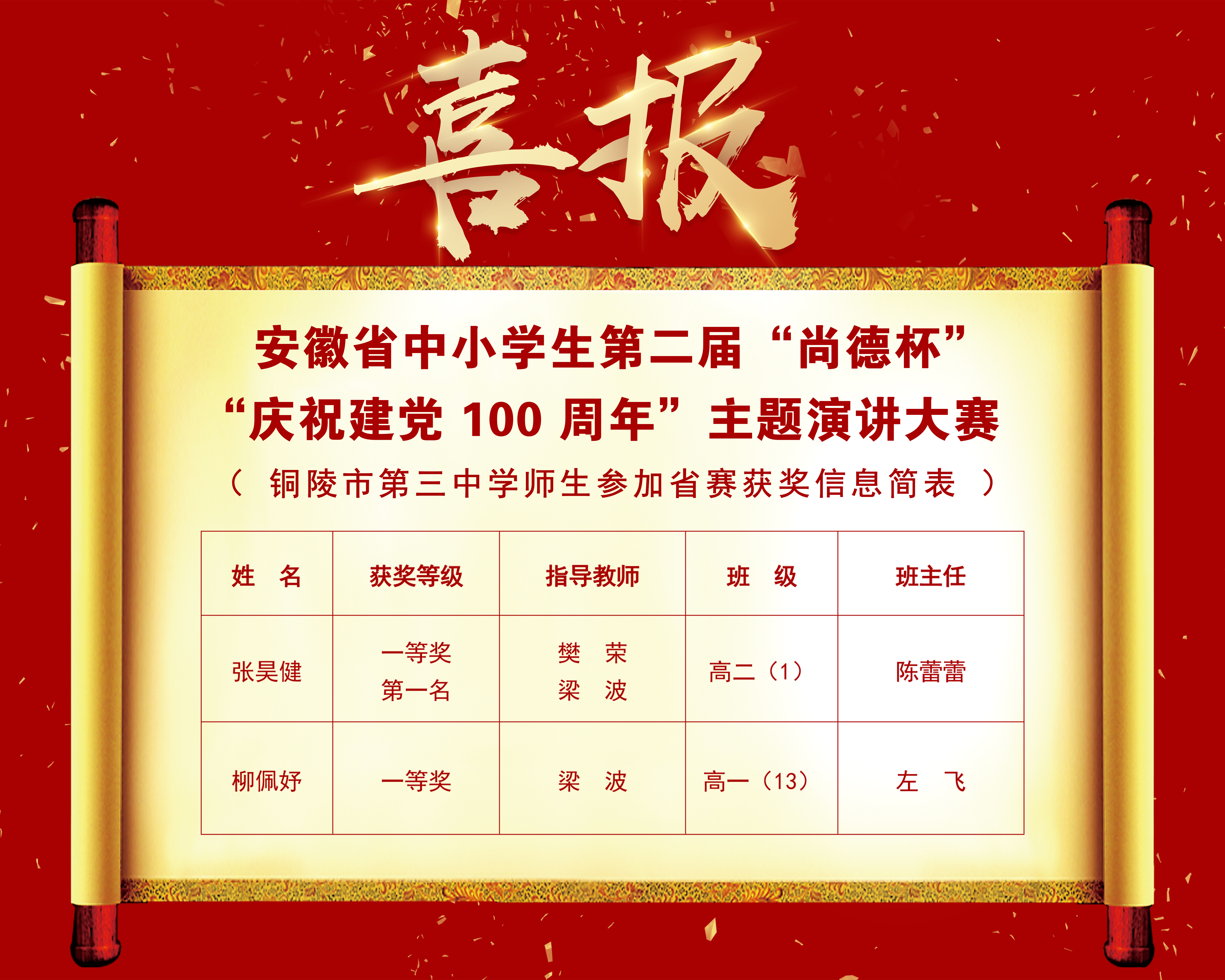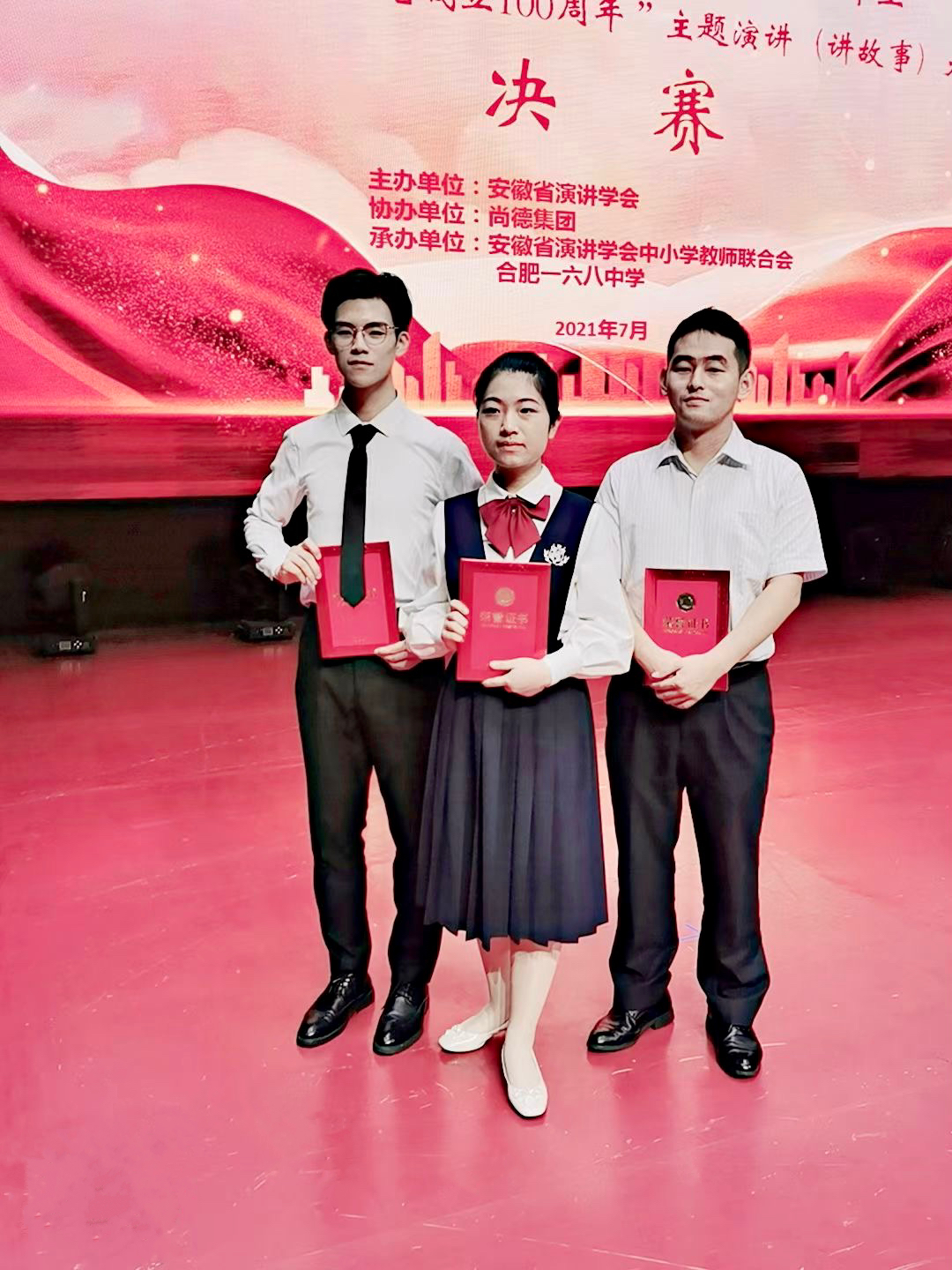 2021年7月4日,安徽省第二届“尚德杯”“庆祝建党 100 周年”主题演讲大赛隆重举行。我校两位学生选手联系国家、学校和个人的发展变化,讴歌中华民族实现伟大复兴的奋斗历程,传承红色基因,赓续革命力量,抒发爱国爱党情怀,取得了骄人的战绩。其中,张昊健同学荣获一等奖第一名,柳佩妤同学荣获一等奖;梁波老师、樊荣老师喜获“优秀指导教师奖”。
