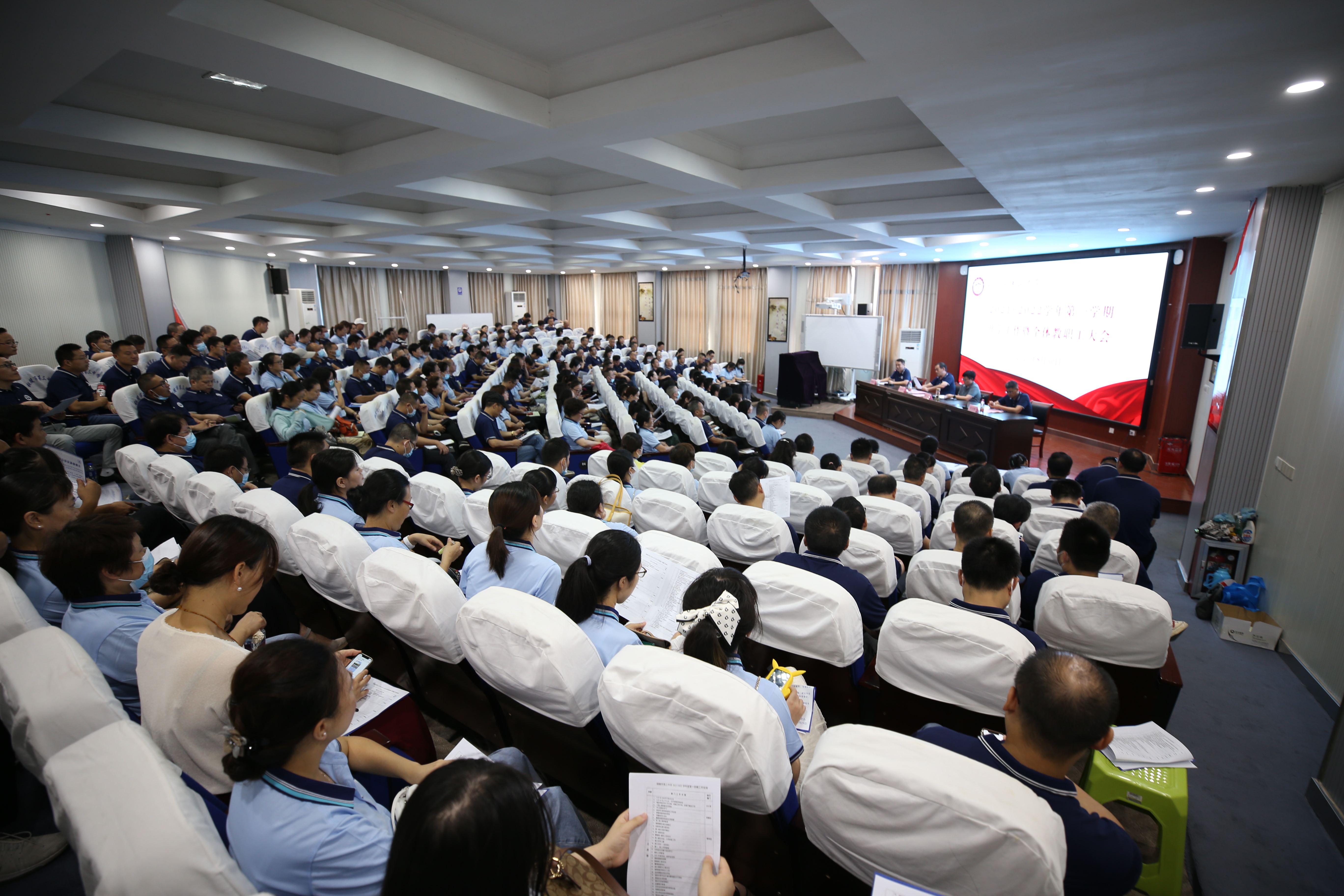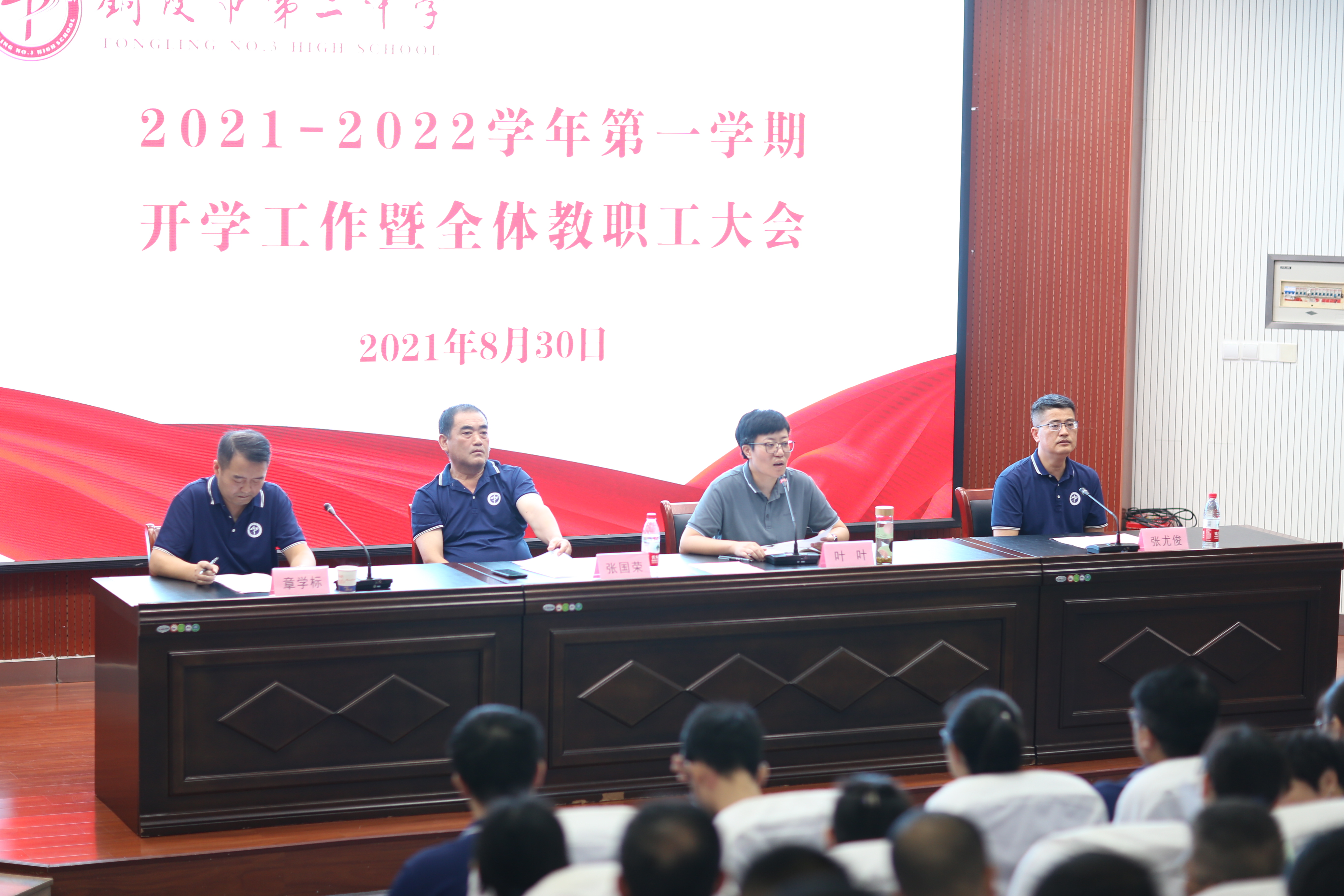 8月30日上午,我校召开新学期开学工作会议暨全体教职工大会,会议由校党委委员、政教处主任章学标主持,校党委书记、校长叶叶,校党委委员、副校长张国荣,校党委委员、副校长张尤俊及全体教职工参会。