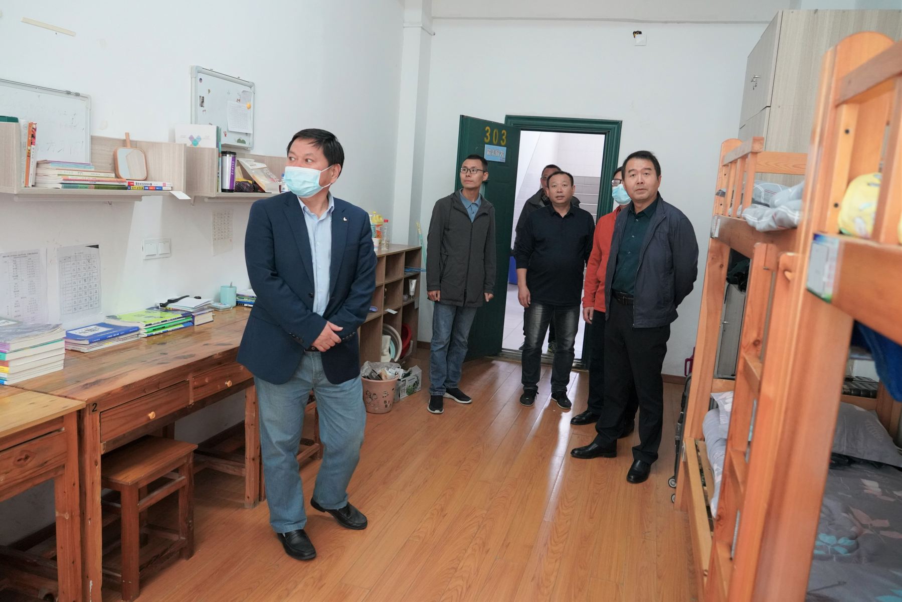 看到学生宿舍物品摆放整齐,卫生健康有保证,王合进特地询问了宿舍管理人员平时的管理细则,热水供应是否正常?消防器材是否过期?空调电线是否安全?有没有充电行为?床铺床柜是否牢固?并就检查出的安全隐患提出了整改意见和建议,要求后勤部门立行立改。