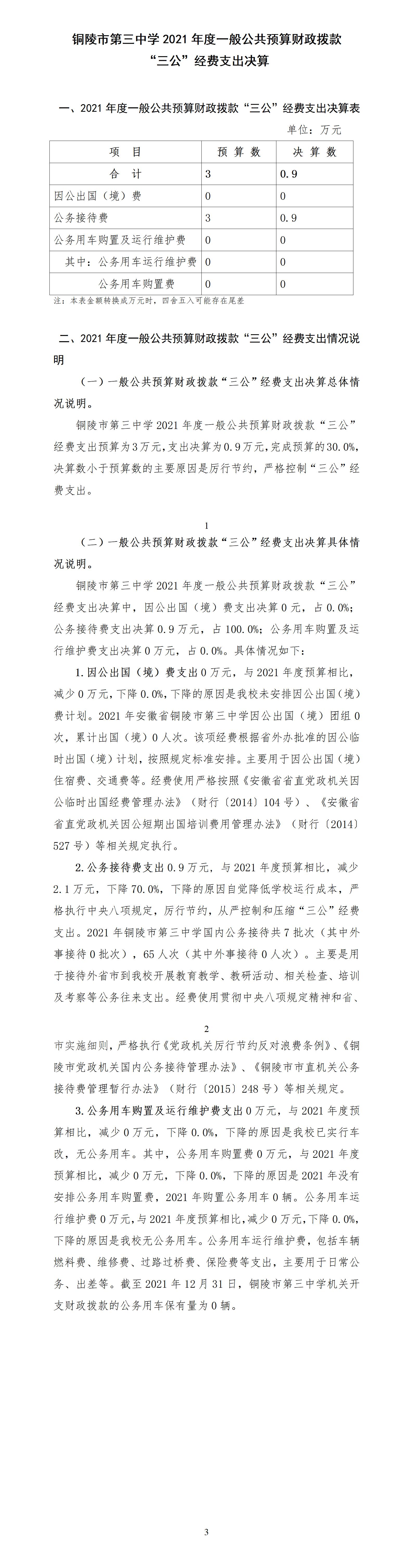铜陵市第三中学2021年度一般公共预算财政拨款“三公”经费支出决算
