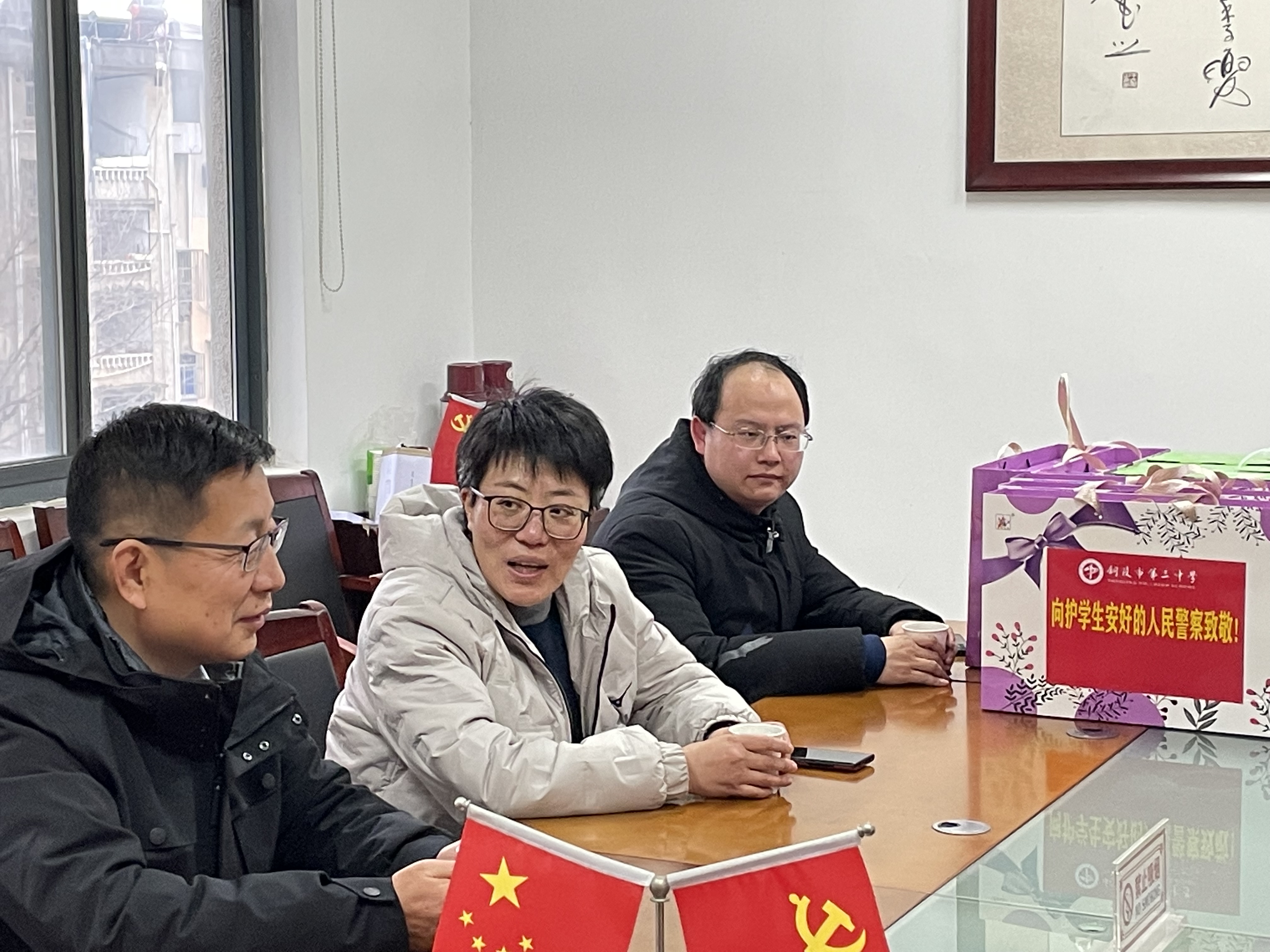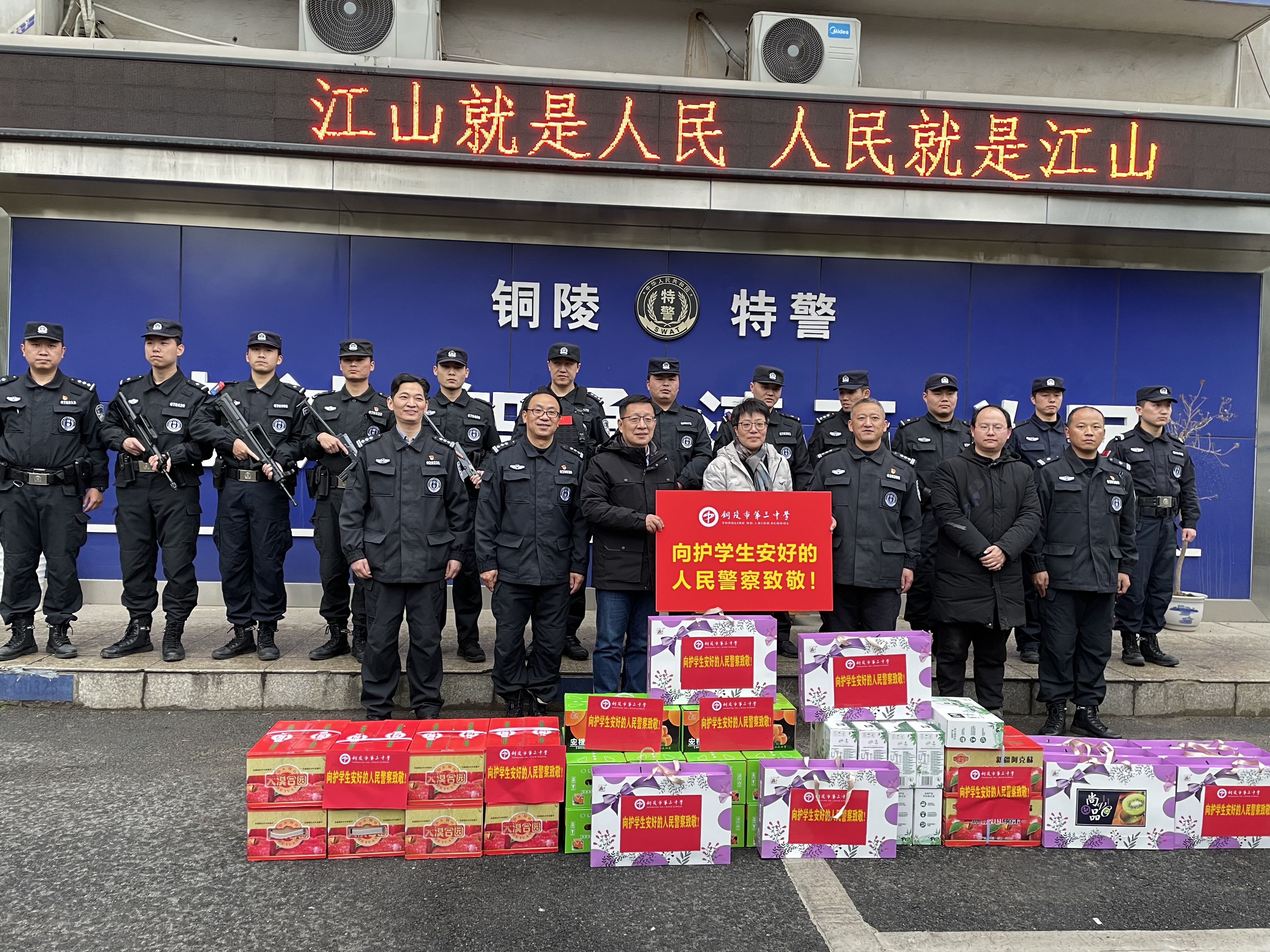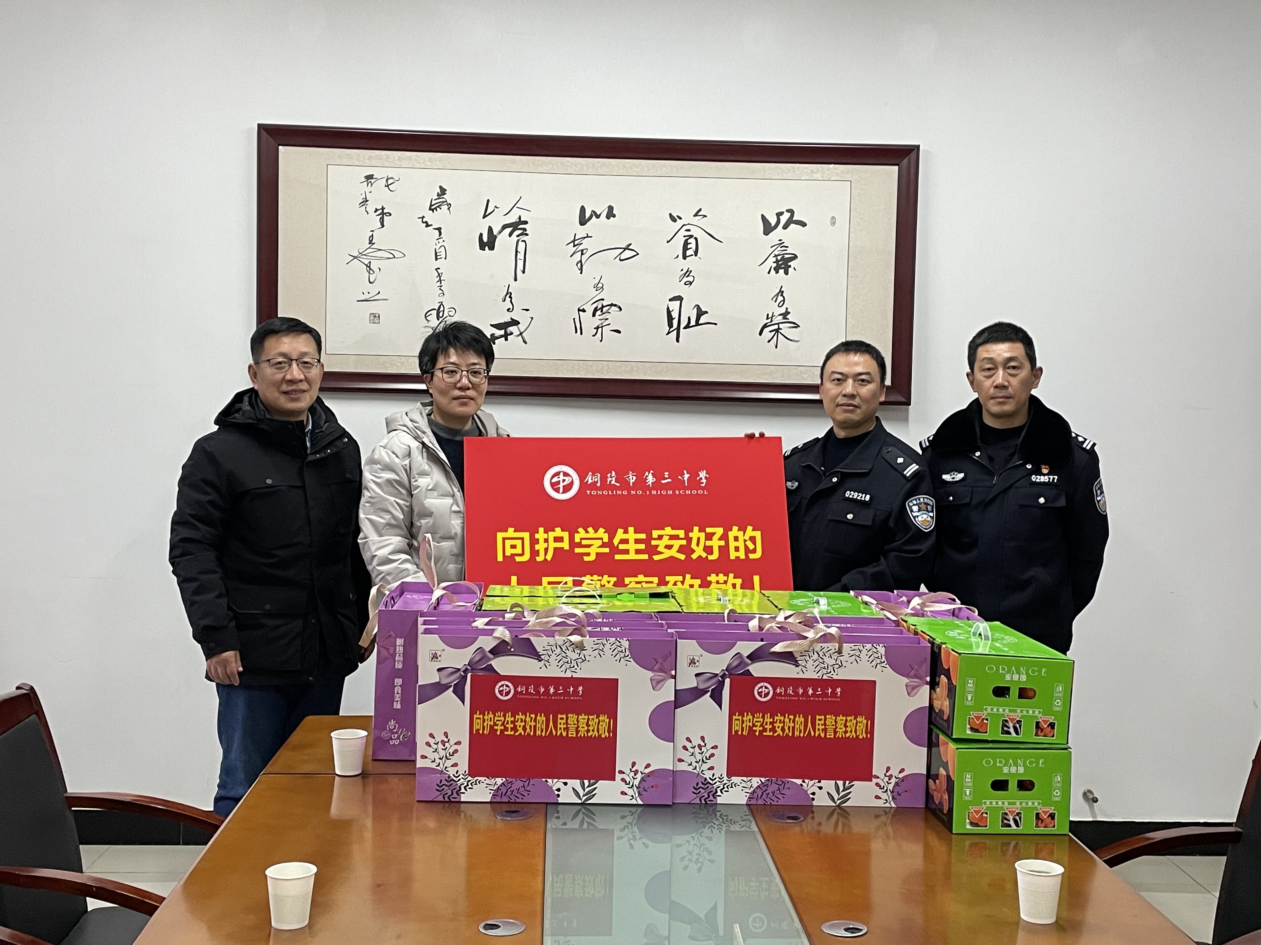 叶校长首先对干警们一年来在维护学校交通秩序和安全稳定方面所付出的辛勤劳动表示衷心感谢。叶校长指出,三中地处市中心,育才路人车混杂,存在着极大的交通安全隐患。自从由交警、民警、特警等多警种组成的护学岗执勤队伍开展执勤以来,三中门口交通拥堵状况得到明显改善,交通安全隐患进一步消除。叶校长动情地说,干警们风雨无阻地为学生保驾护航,筑牢了一道校园安全的屏障,他们是学生安全的守护神,他们是校园门口一道最靓丽的风景线。叶校长最后希望全体干警在新的一年里继续为我校高质量发展和师生安全保驾护航。