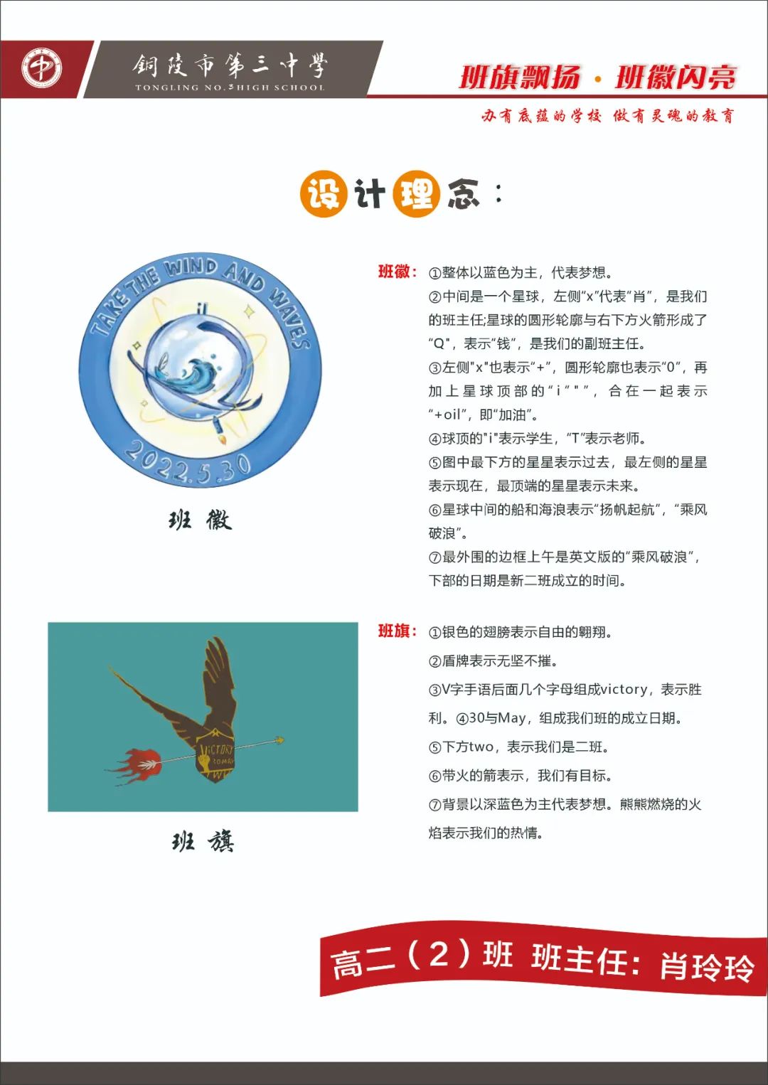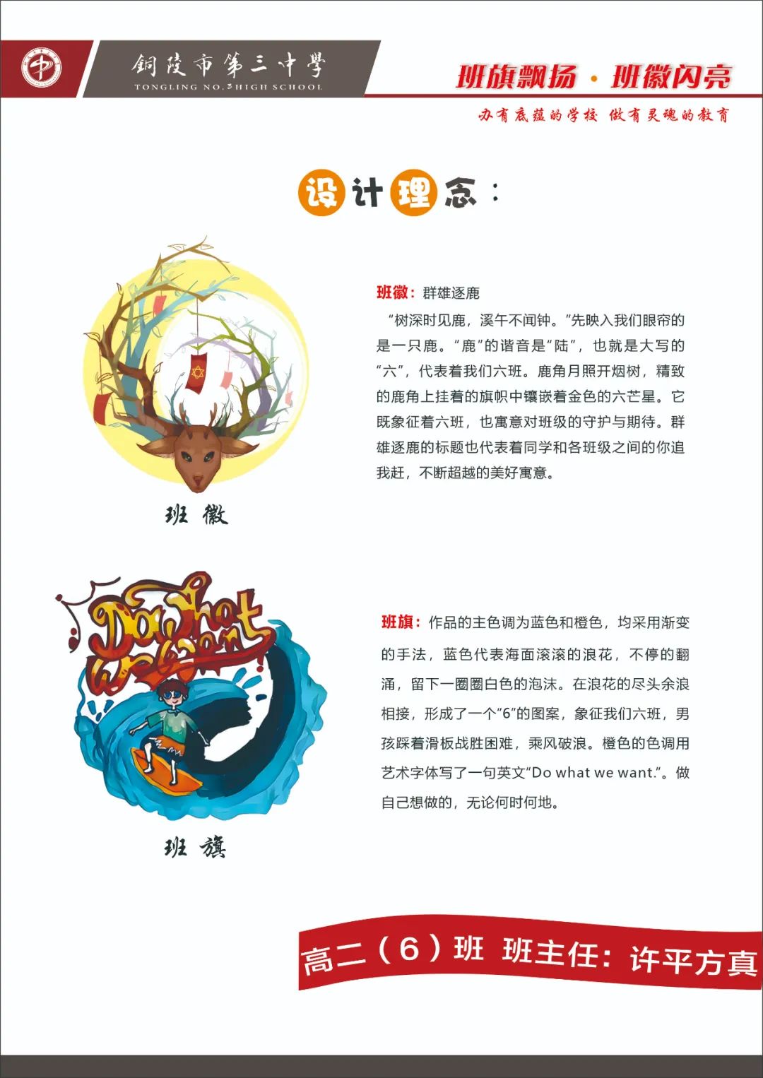 为培养学生的创新意识和审美情趣,增强学生的团队精神和集体观念,展现各班良好的班风、班貌,我校高二年级各班老师与同学们通力合作,充分发挥想象力,设计出各具特色的班旗、班徽。