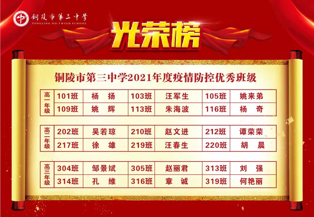 2021年度即将结束,我校疫情防控工作得到了各处室、各年级部、各班级的大力支持和配合,各班主任积极落实晨午检和病因追踪制度,坚持“日上报”“零上报”,并督促班级管理员完成每日健康打卡工作,付出了大量时间和精力。为更好地做好疫情防控工作和表彰先进,筑牢疫情防控安全网,现根据每日健康打卡和晨午检上报情况,结合年级部推荐,优中选优,现对在本年度疫情防控工作中表现优秀班级予以表彰。