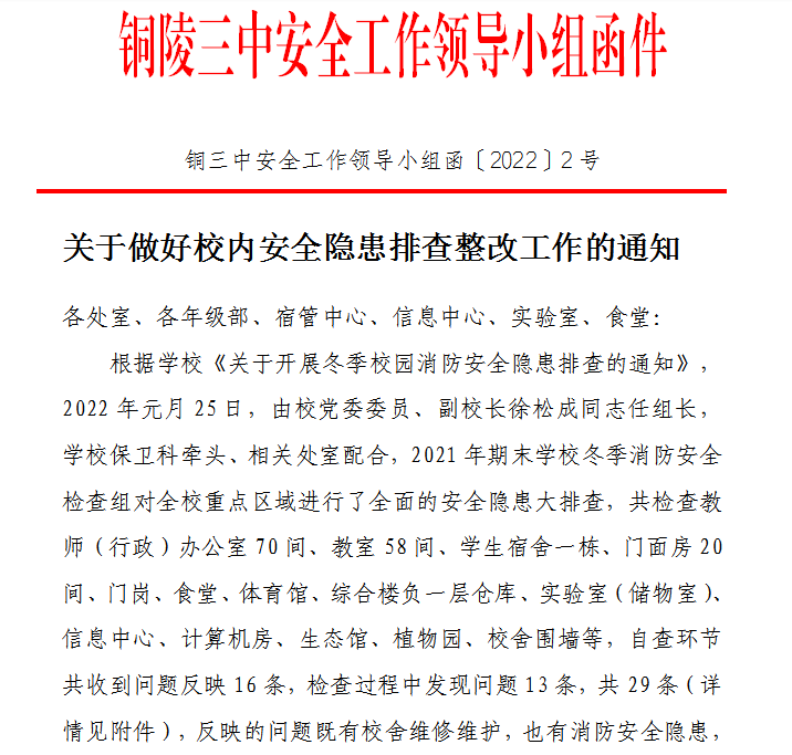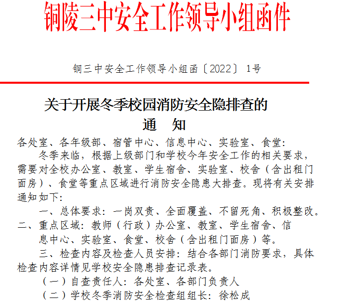 保卫科认真筹划,精心组织。元月9日校保卫科下发《铜陵市第三中学关于开展冬季校园消防安全隐患排查的通知》,对安全隐患排查工作作出详细部署和安排。