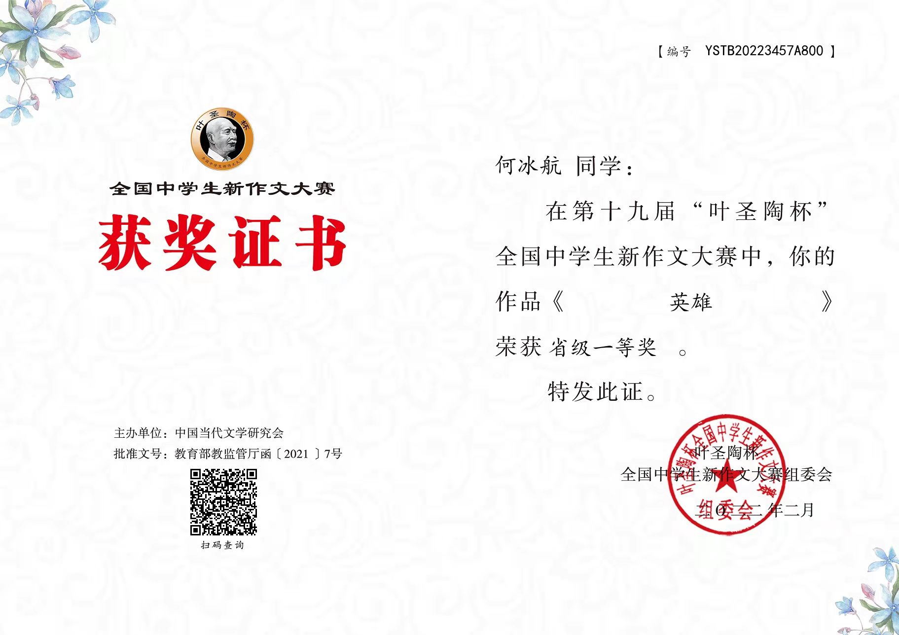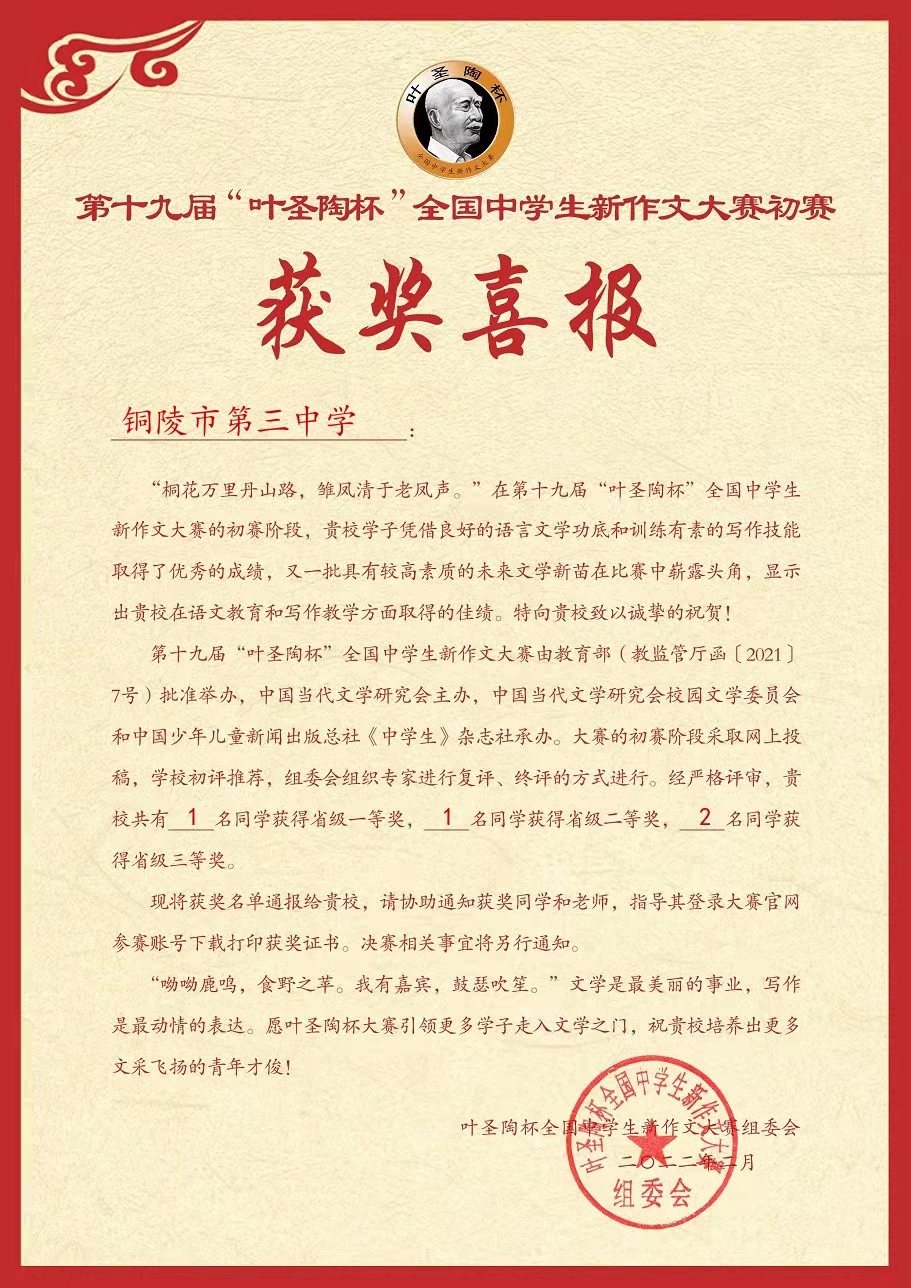 近日,第十九届“叶圣陶杯”全国中学生新作文大赛初赛评审结束。经过初评、复评,我校共有4名学生获得初赛奖项。其中116班何冰航获省级一等奖、217班章韶旻获省级二等奖、217班王思瑶和213班周洁获省级三等奖。向取得优异成绩的同学们表示祝贺!