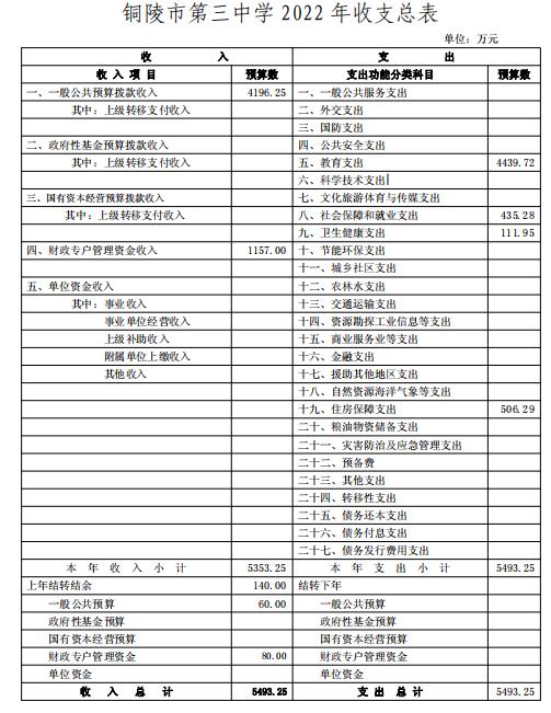 按照综合预算的原则,铜陵市第三中学所有收入和支出均纳入单位预算管理。铜陵市第三中学 2022 年收支总预算5493.25 万元,收入包括一般公共预算拨款收入、财政专户