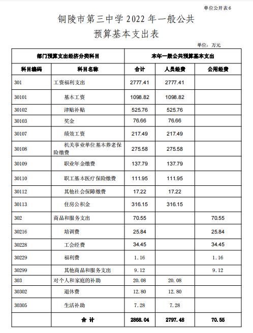 铜陵市第三中学2022年一般公共预算基本支出2868.04万元,其中,人员经费 2797.48 万元,公用经费 70.55 万元。