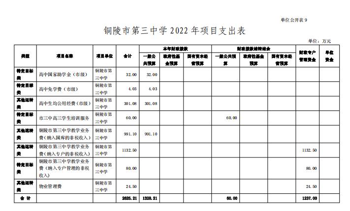 铜陵市第三中学 2022 年预算共安排项目支出 2625.21万元,比 2021 年预算增加 2625.21 万元,增长原因主要是预算科目调整,将经常性专项等调整为机构运转类项目支出预算。主要包括:本年财政拨款安排 1328.21 万元(其中,