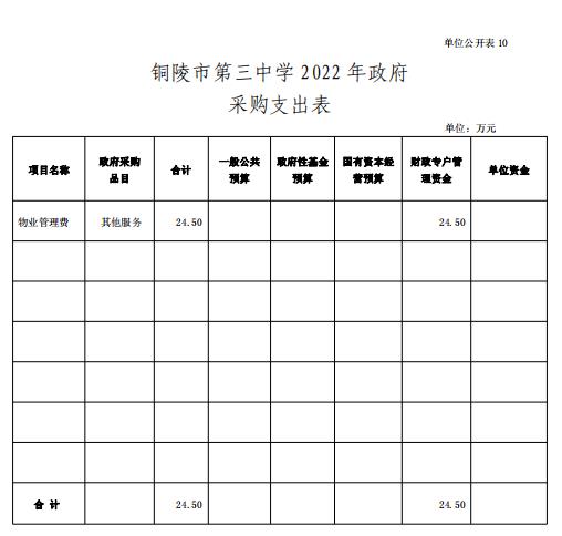 铜陵市第三中学 2022 年政府采购预算 24.50 万元。其中:政府采购货物预算 0 万元,政府采购工程预算 0 万元,政府采购服务预算 24.50 万元。