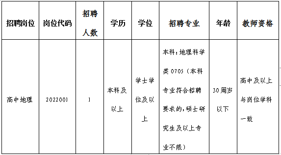 为进一步加强我校教师队伍建设,切实吸引急需学科教师来我校从事教育教学工作,根据“铜揽英才 陵创未来”铜陵市2021年高中阶段学校紧缺学科“招才引智”招聘情况,结合我校实际,经研究同意,特面向教育部直属6所师范院校开展公开招聘高中地理教师1名。根据教育部《关于设立教育部基础教育综合改革试验区的通知》(教基厅函〔2021〕38号)、教育部等八部门《关于进一步激发中小学办学活力的若干意见》(教基〔2020〕7号)、安徽省教育厅等四部门《关于进一步完善中小学教师招聘制度落实市县中小学教师招聘主体责任的通知》(皖教秘师〔2020〕90号)等文件精神,现将有关事项公告如下。