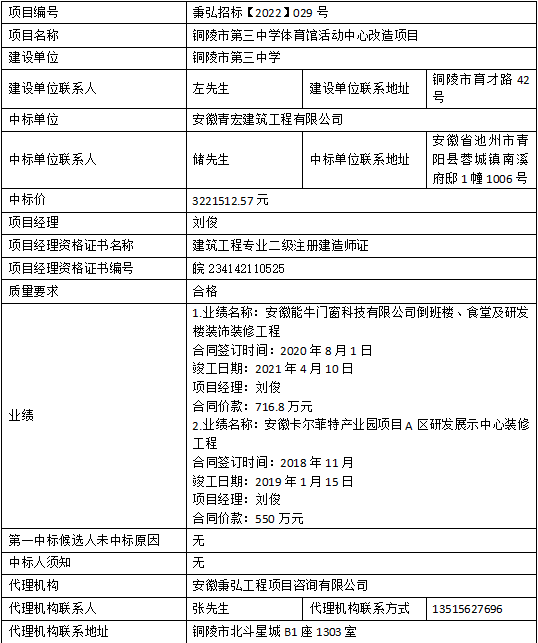 铜陵市第三中学体育馆活动中心改造项目中标结果公示