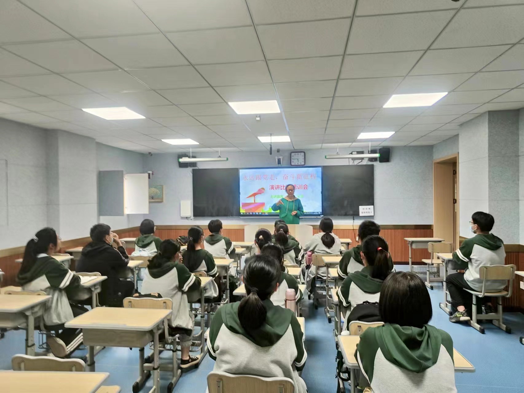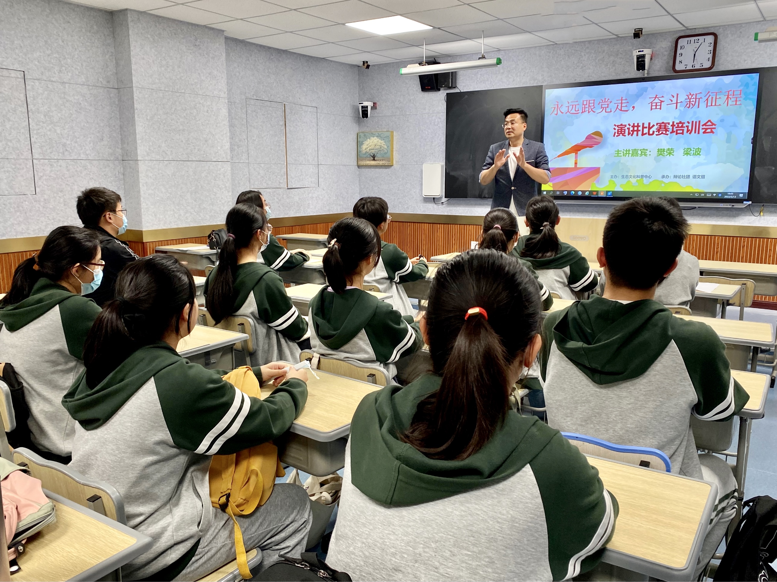 为了帮助同学们备战演讲,樊荣老师强调:比赛前,精心准备稿件至关重要。演讲稿要主题鲜明,观点正确,材料生动,内容充实,令人信服。比赛中,声情并茂演讲引发共鸣。语气、语调、语速把握得当,有感染力,有恰当的面部表情和肢体语言,表达青少年的真情实感,积极向上。比赛后,及时交流更有温度。演讲者要主动与评委教师交流,演讲者和指导教师要交流,演讲者之间要相互学习,取长补短,努力提升自己的演讲水平。