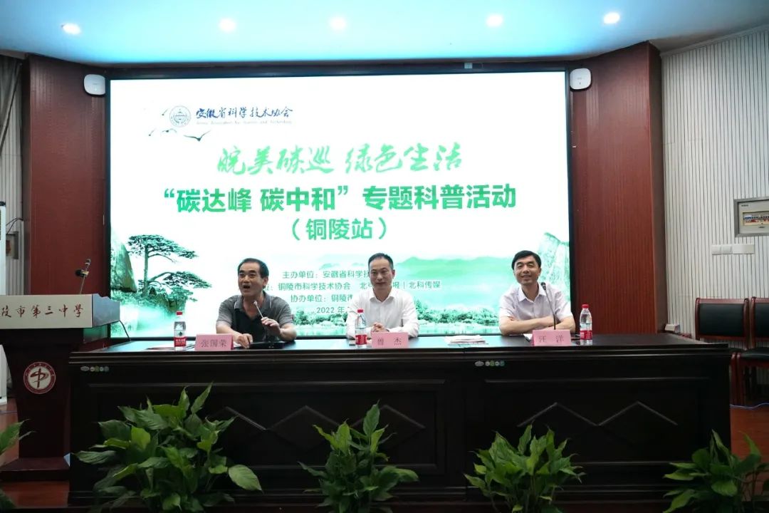 7月7日下午,由安徽省科学技术协会主办、铜陵市科学技术协会和北京科技报(北科传媒)承办、铜陵市第三中学协办的“皖美碳巡 绿色生活”——碳达峰、碳中和专题科普活动(铜陵站)今天下午在多功能厅举行。