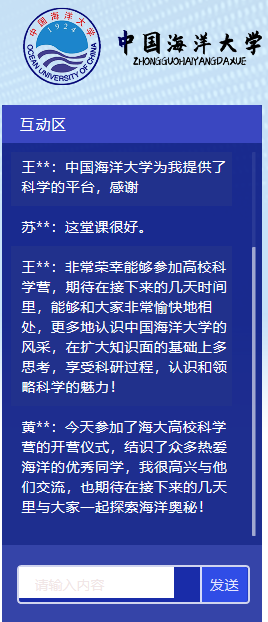 在开营仪式线上见面会上,通过自我介绍和交流感悟等方式,我校10名品学兼优的营员及领队钱蕾教师拉近了与中国海洋大学分营辅导员的情感,增进了营员与老师间的信任,增强了热爱科学的动力。