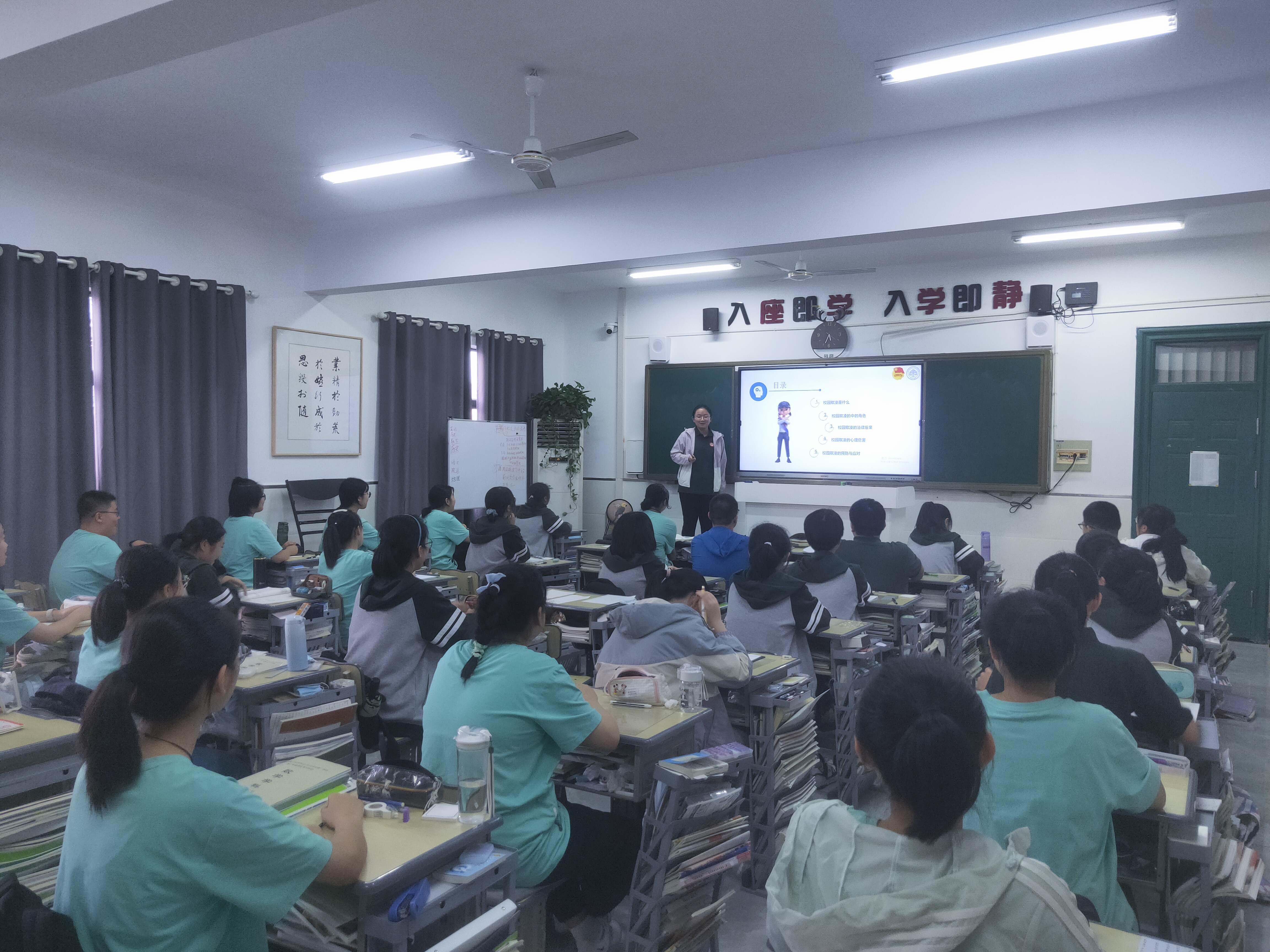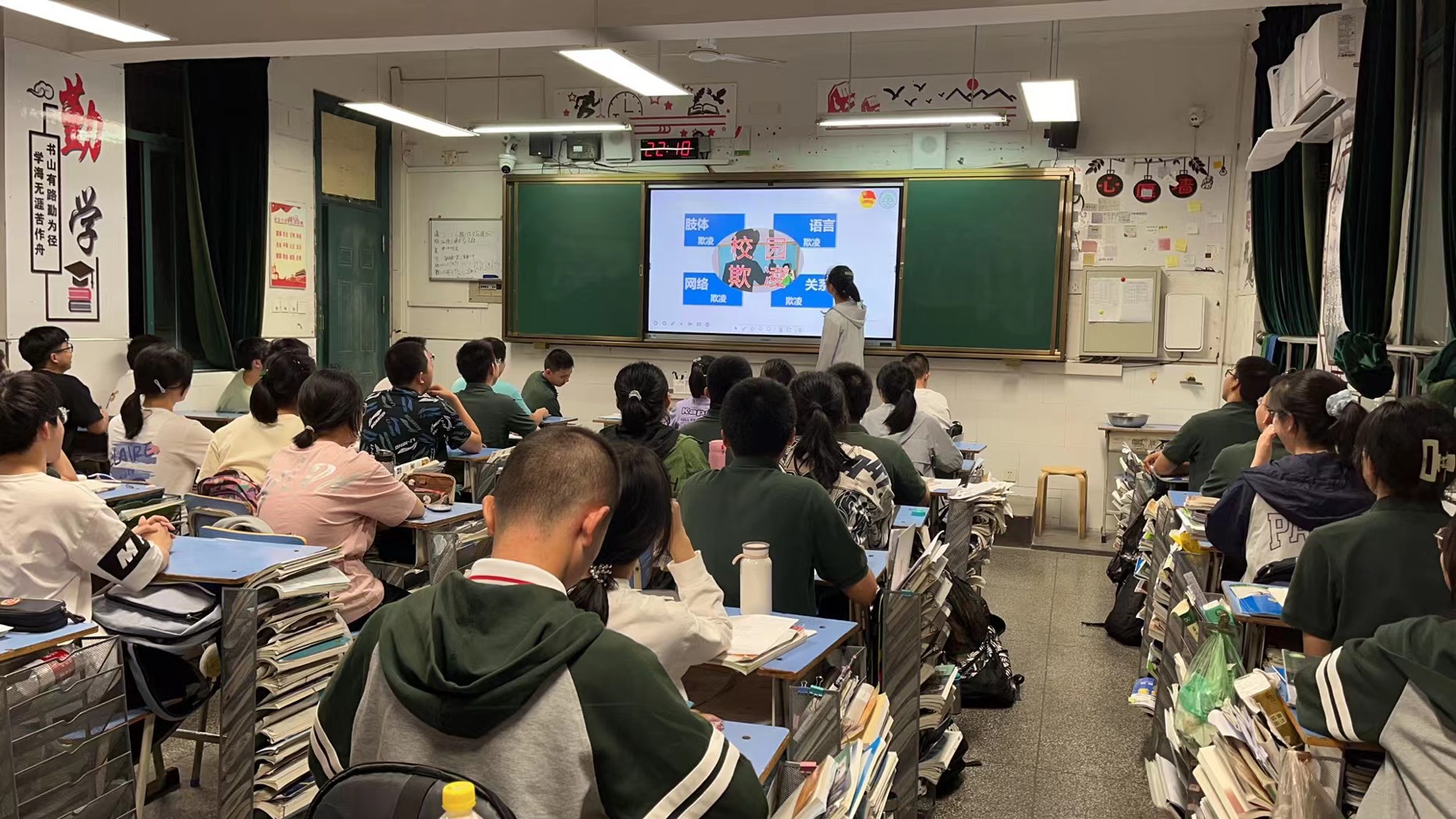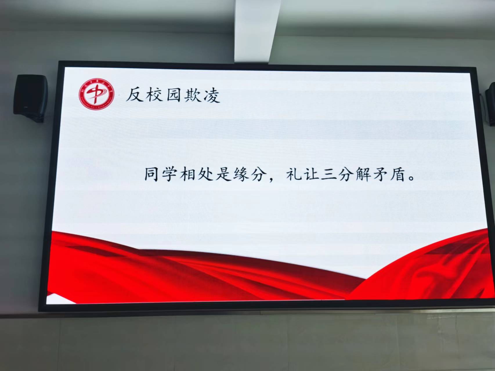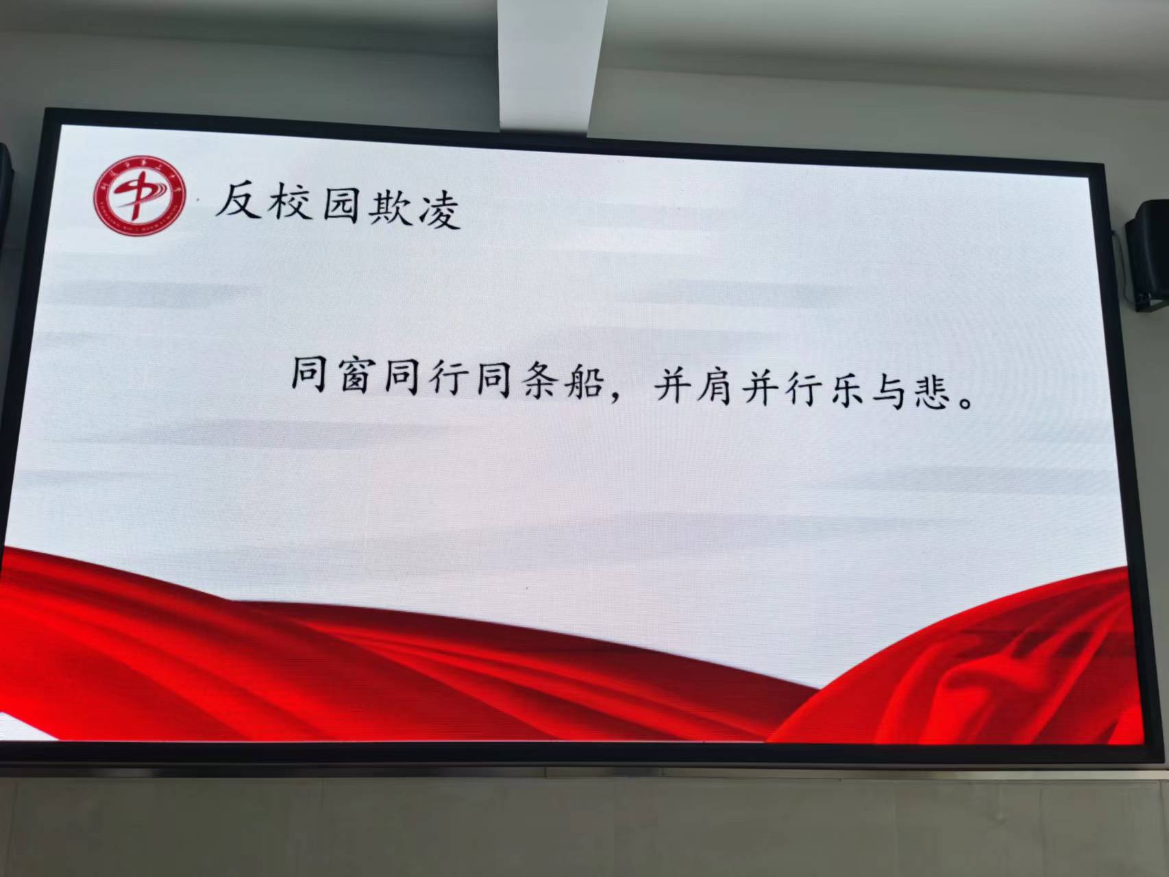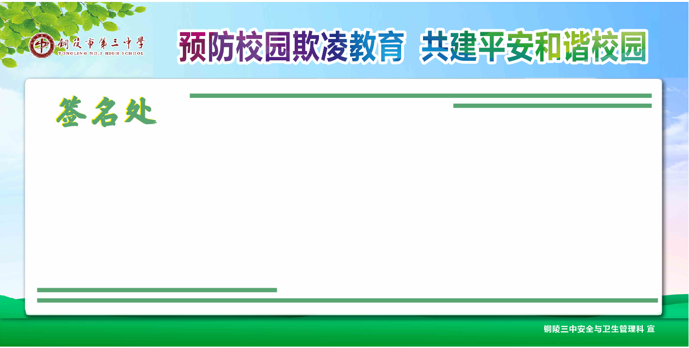 活动中,学校以班级为单位召开以“预防校园欺凌”为主题的班会,通过专题课件、视频播放等形式向学生进行展示,让学生认识什么是校园欺凌、当遇到校园欺凌时怎样保护自己、校园欺凌的法律后果、校园欺凌的心理危害等等,同时,学校还利用各教学楼电子屏、校园警务联络室电子屏、展板等形式广泛宣传,并组织学生进行现场签名活动,让学生进一步提高自我保护意识,真正把预防校园欺凌谨记心中。
