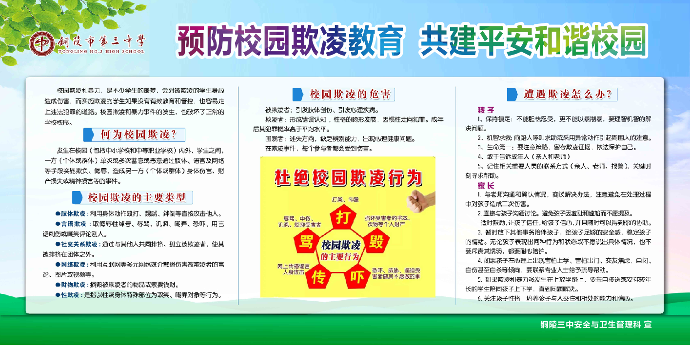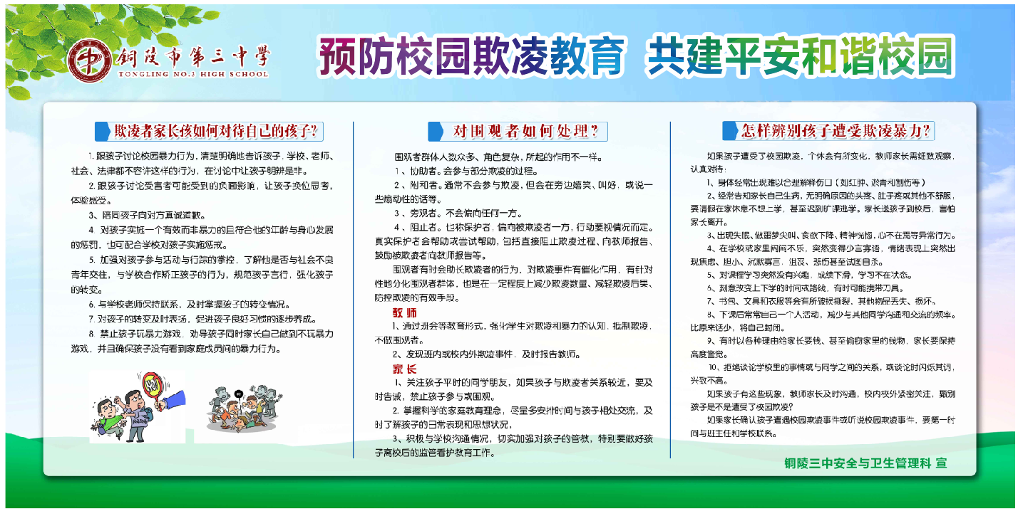 为增强学生安全意识和自我保护能力,预防校园暴力事件,进一步构建平安和谐校园,近日,我校在全校范围内开展“我的孩子我护航”校园防欺凌主题教育等系列活动。