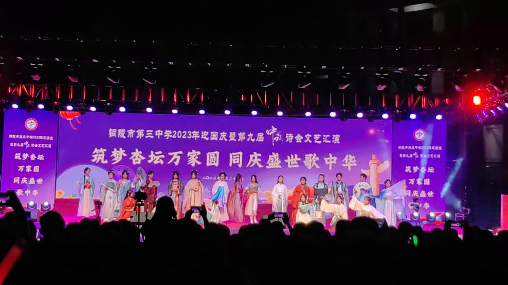 “万里无云镜九州,最团圆夜是中秋”,9月28日中秋之夜,铜陵市第三中学迎国庆暨第九届中秋诗会文艺汇演上,汉服社呈上的一场别开生面的国风大典,吸引了众多师生的目光。