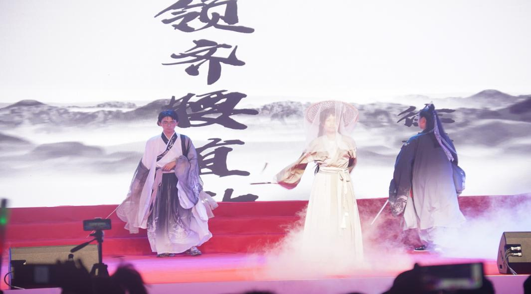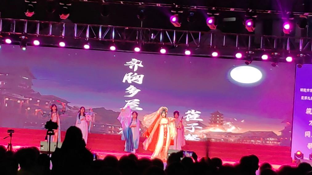 在文艺汇演现场,身着华丽汉服的演讲者以优雅的仪态、抑扬顿挫的语调,娓娓道来古人的衣着之韵:汉服是中国“衣冠上国”、“礼仪之邦”、“锦绣中华”的体现,承载着中华民族染、织、绣等工艺和美学,传承30多项中国非物质文化遗产以及受保护的中国工艺美术。晋制汉服,色彩深沉,质地厚重;唐制汉服,华丽大气,宽松稳重;明制汉服,古朴简约,色彩明快。