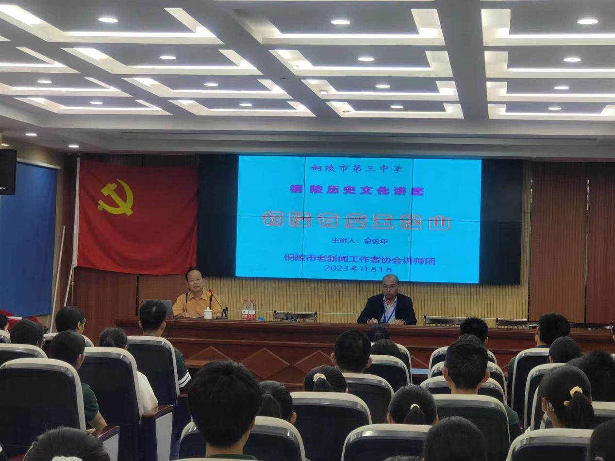 五松山文化是三中校园文化主体组成,为了更好的溯源历史、了解铜陵的区域文化,11月1日下午,我校“五松山文化融入语文课程探究“课题小组特邀请市新闻工作者协会讲师团成员俞俊年老师前来与课题组老师座谈交流,并为部分学生作“铜陵有座五松山“的报告会。