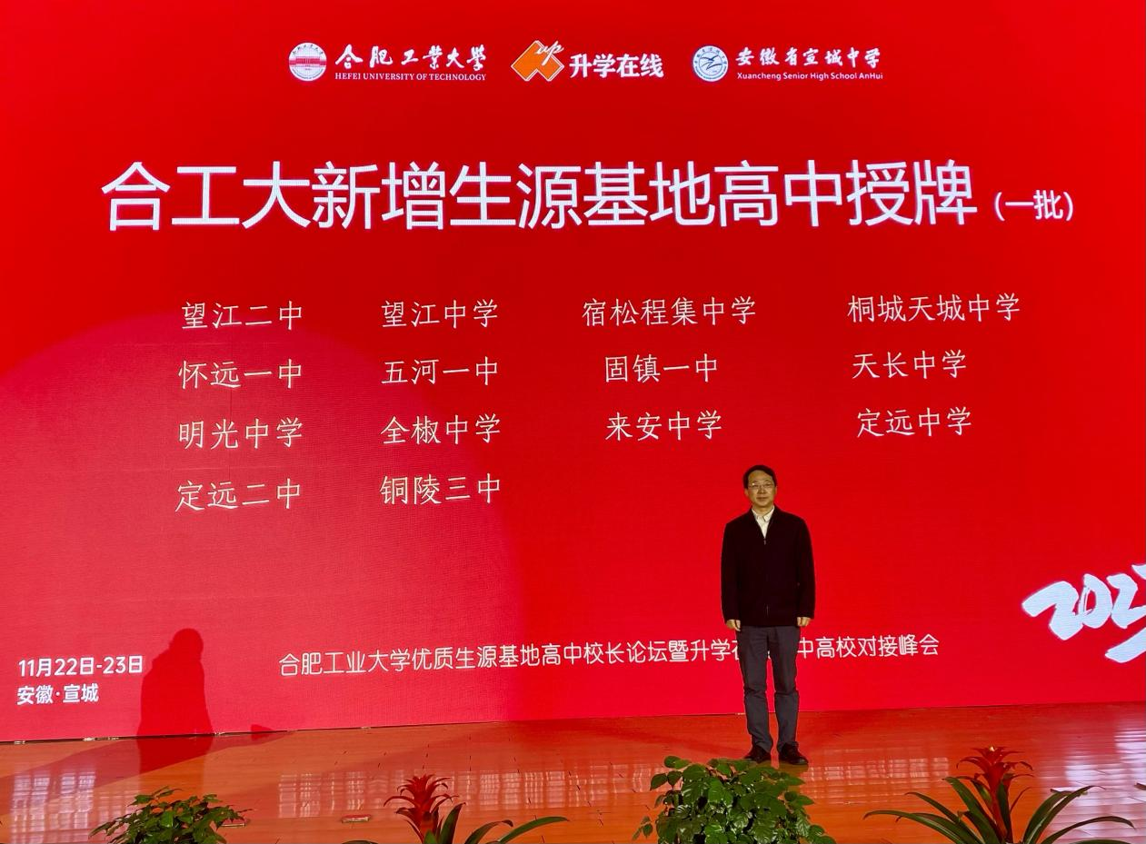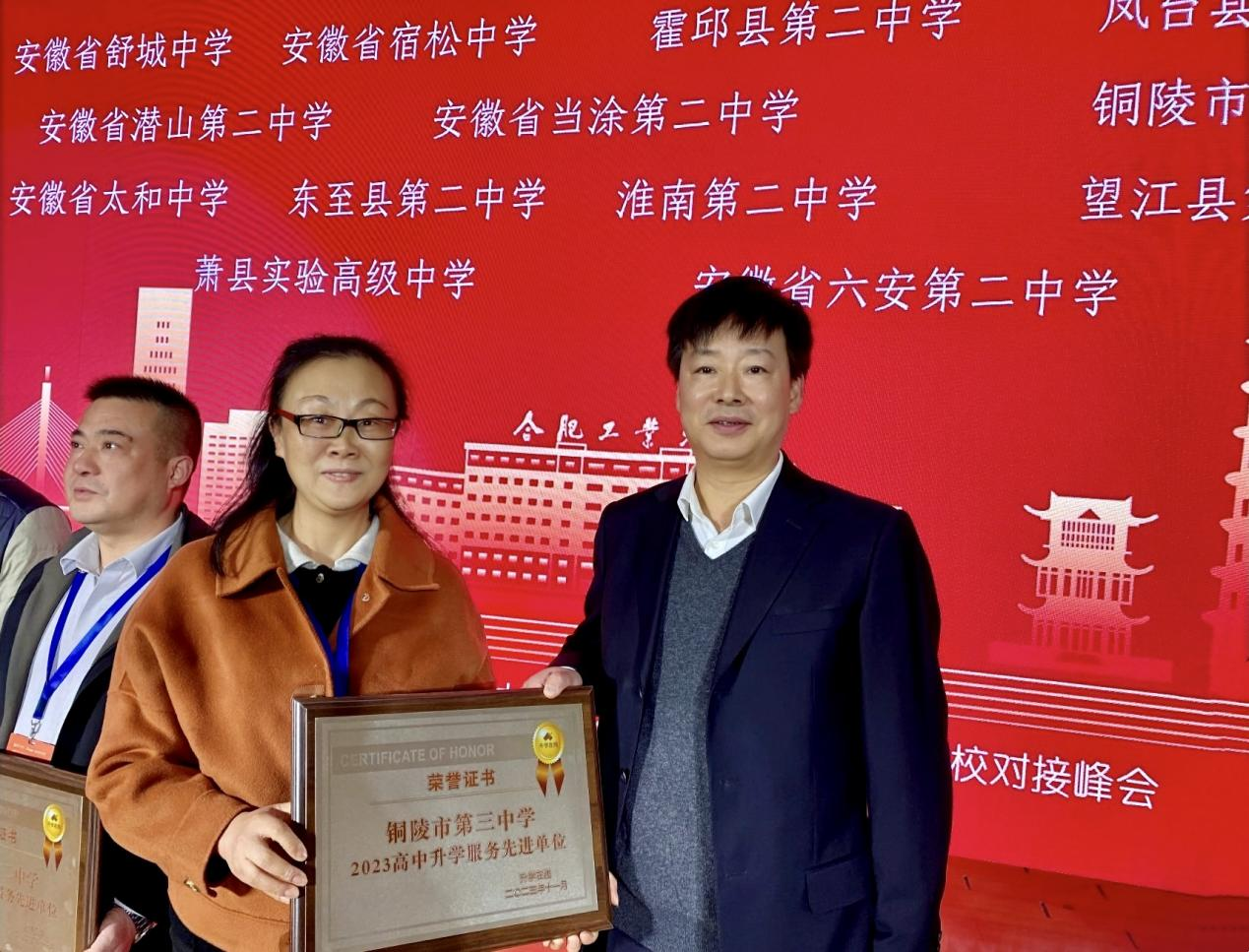 合肥工业大学优质生源基地高中校长论坛暨升学在线高中高校对接峰会在合肥工业大学宣城校区召开。会上,合肥工业大学郑磊校长授予铜陵三中等学校为“合肥工业大学优质生源基地”。安徽省教育招生考试院沈滔院长授予铜陵三中等学校为“2023升学服务先进单位”。合肥工业大学是中华人民共和国教育部直属全国重点大学,教育部、工信部和安徽省政府共建高校,国防科工局与教育部共建高校。学校创建于1945年,1960年被中共中央批准为全国重点大学。刘少奇、朱德、董必武、陈毅、邓小平等老一辈无产阶级革命家先后来校视察指导工作,邓小平同志1979年亲笔为学校题写了校名。学校2005年成为国家“211工程”重点建设高校,2009年成为国家“985工程”优势学科创新平台建设高校,2017年进入国家“双一流”建设高校行列。