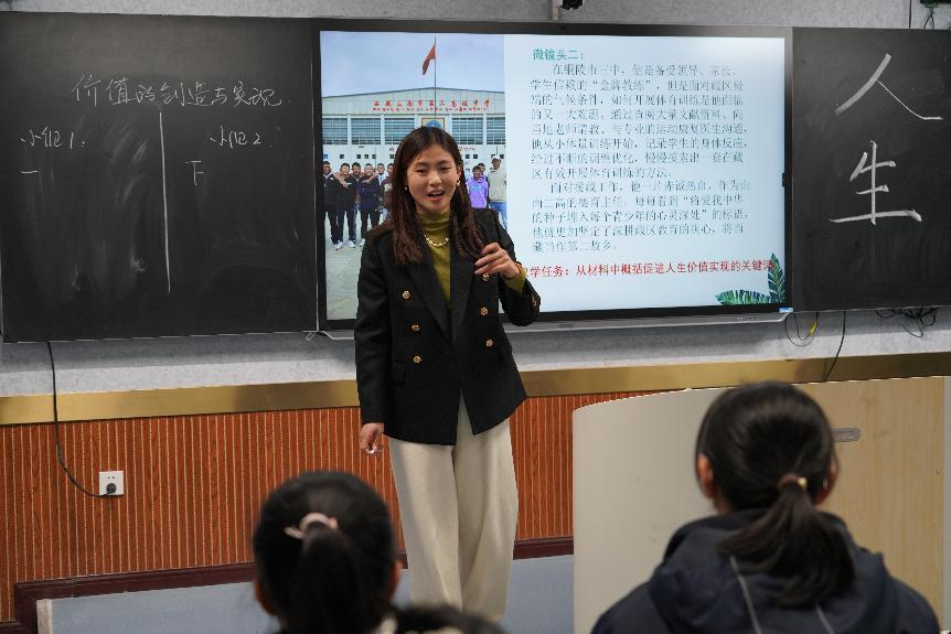 来自安徽师范大学附属外国语学校的王琴老师带来展示课《价值的创造与实现》,王老师用心地选取了我校援藏教师刘犇的先进事迹,以身边人、身边事的视角走进课本,充分调动了学生的探究兴趣。以“遇见光:烛光伴随成长路——追逐光:星光照亮前行路——成为光:火光温暖人生路”为议题,从一个人到一代人再到代代人,由先进人物镜像到整体群像再到当代优秀青年形象描摹,引导学生看见价值、感悟价值、升华价值,从而在发现美、陶冶美、追求美的过程中走出课本,构建“三美”课堂。