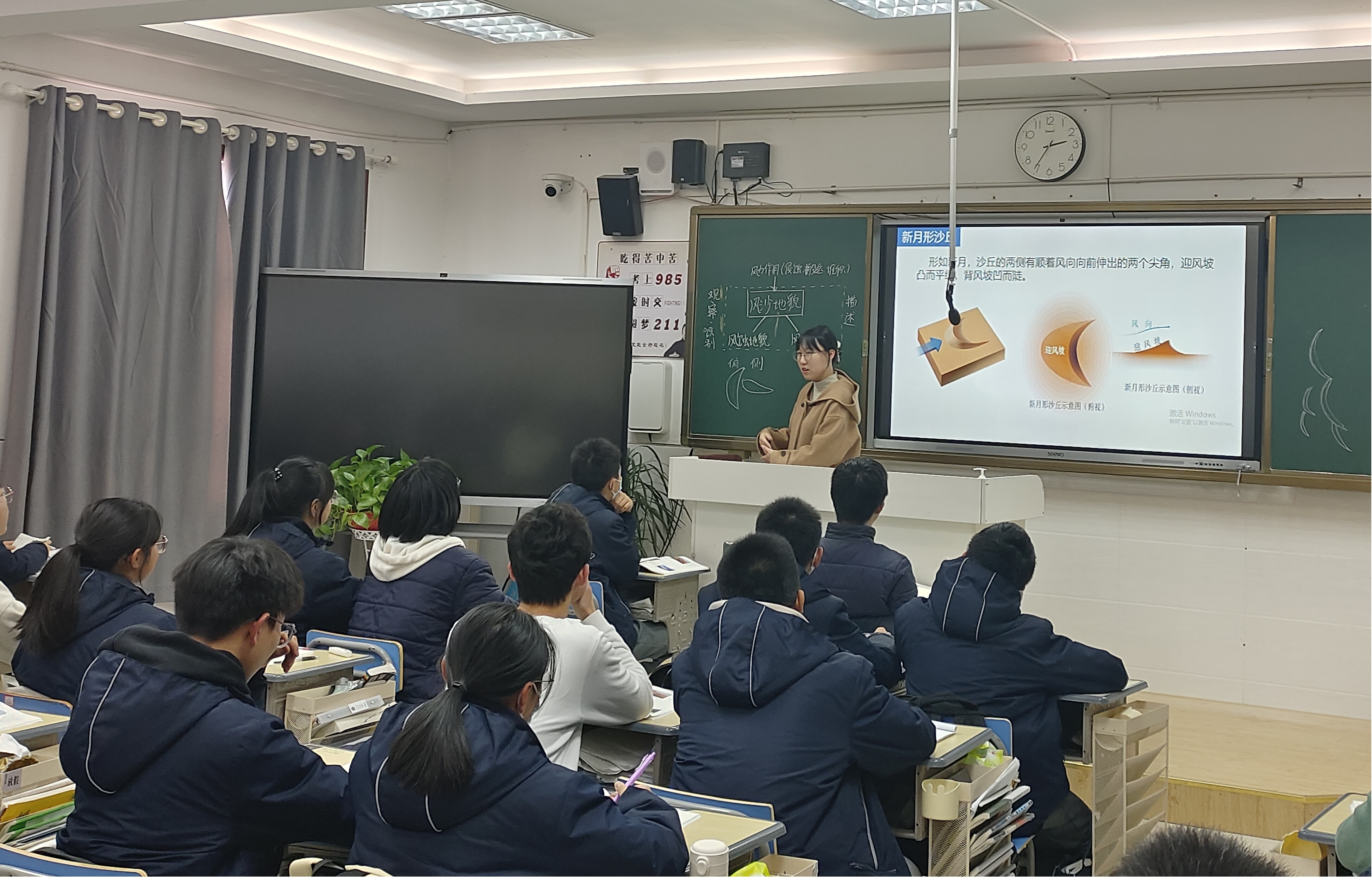 在课堂教学中,赵老师以1959年春我国第一支沙漠考察队“进军”塔克拉玛干沙漠为真实情境,通过风的作用小实验,赵老师带领同学们学习了风沙地貌的概念,以此为基础,不断穿插影视资料,开始了一节精彩纷呈的“科学考察课”。通过设置相关科考任务,绘制观察图片等教学方式,逐步探究风蚀地貌和风沙地貌的外貌特征及成因。并通过当地村民修建篱笆墙来防沙的子情境,分析流动沙丘对人类的影响以及防治流沙的措施。问题设置层层递进,教学环节过渡自然,教学情境引人入胜,课堂氛围生动活泼。