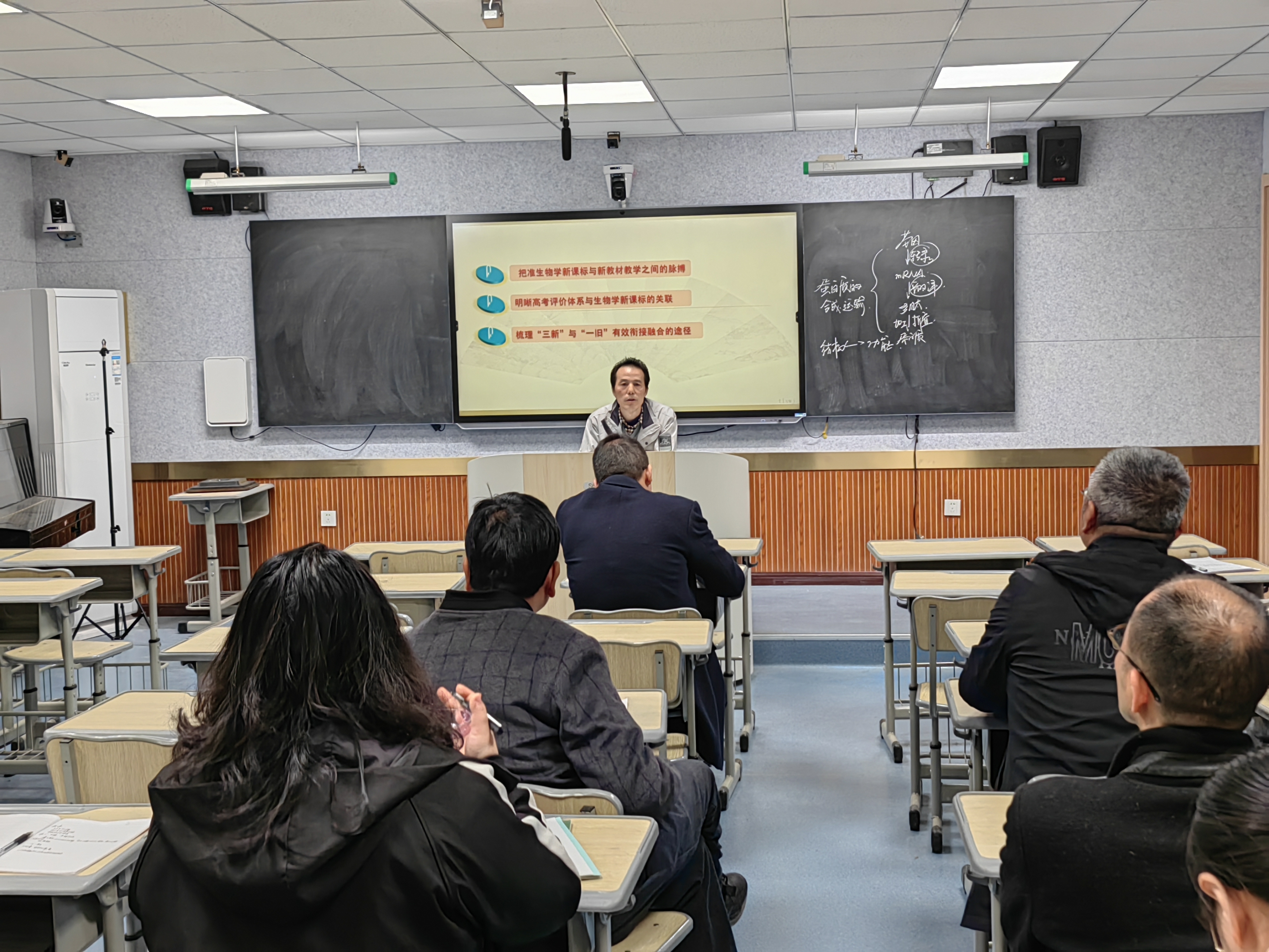 第三项议程由铜陵中学名教师杨京举做了题为《2023年“三新一旧”下生物学高考的几点思考》的主题报告。杨老师从把握生物学新课标与新教材之间的脉搏、明晰高考评价体系与生物学新课标的关联、梳理“三新”与“一旧”有效衔接融合的途径三大方面分享了他对于2023届新课标老高考的深入思考。他指出,新课标是高考命题的根本依据,高考评价体系与新课标核心内容相同,但表现形式不同,我们在备考教学中需高度重视课标的作用,精心设计教学,落实新课标的要求。他建议二轮复习尝试“能力专题”,以教材为本,以问题为纲,以新高考真题为载体,注重训练学生的科学思维。