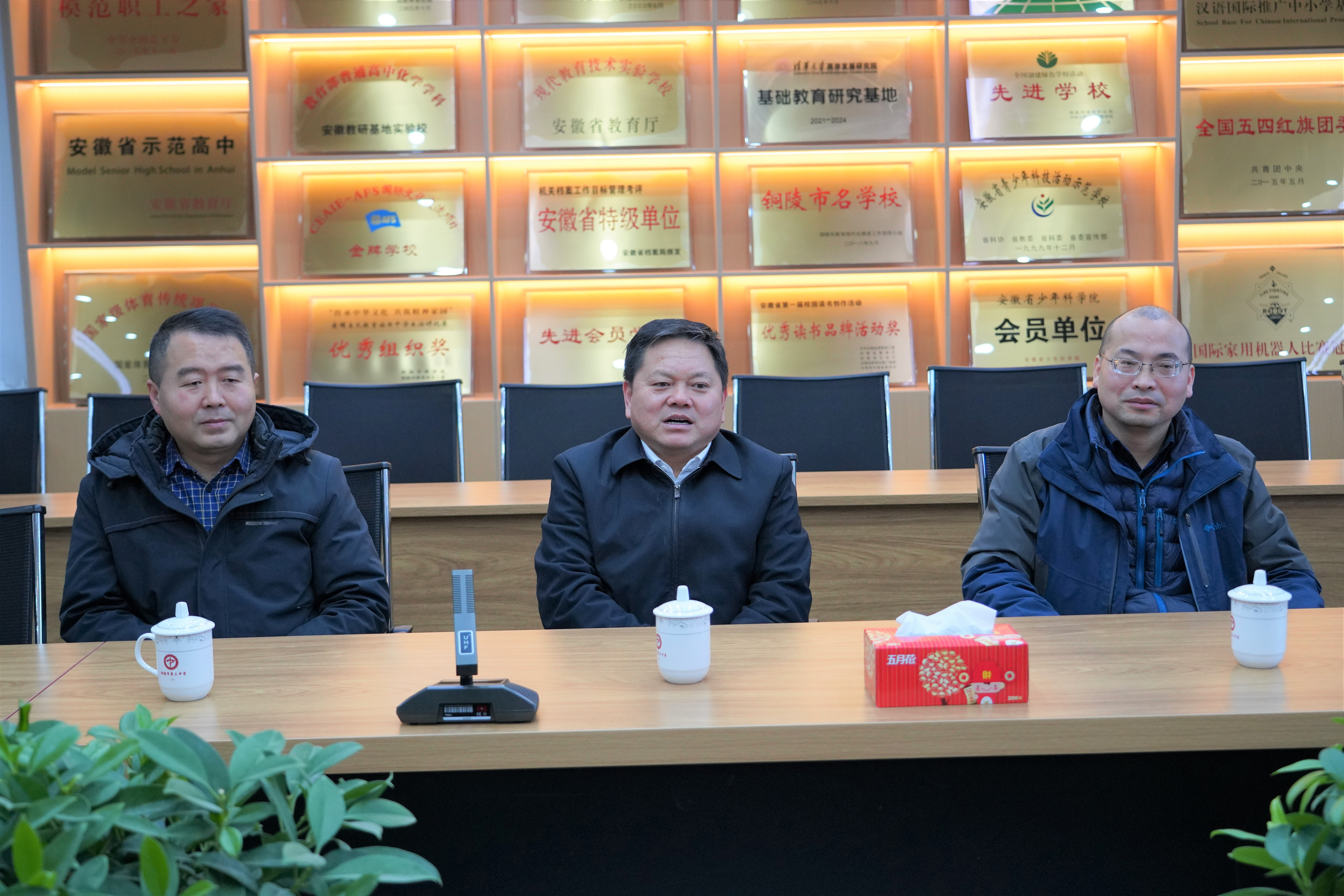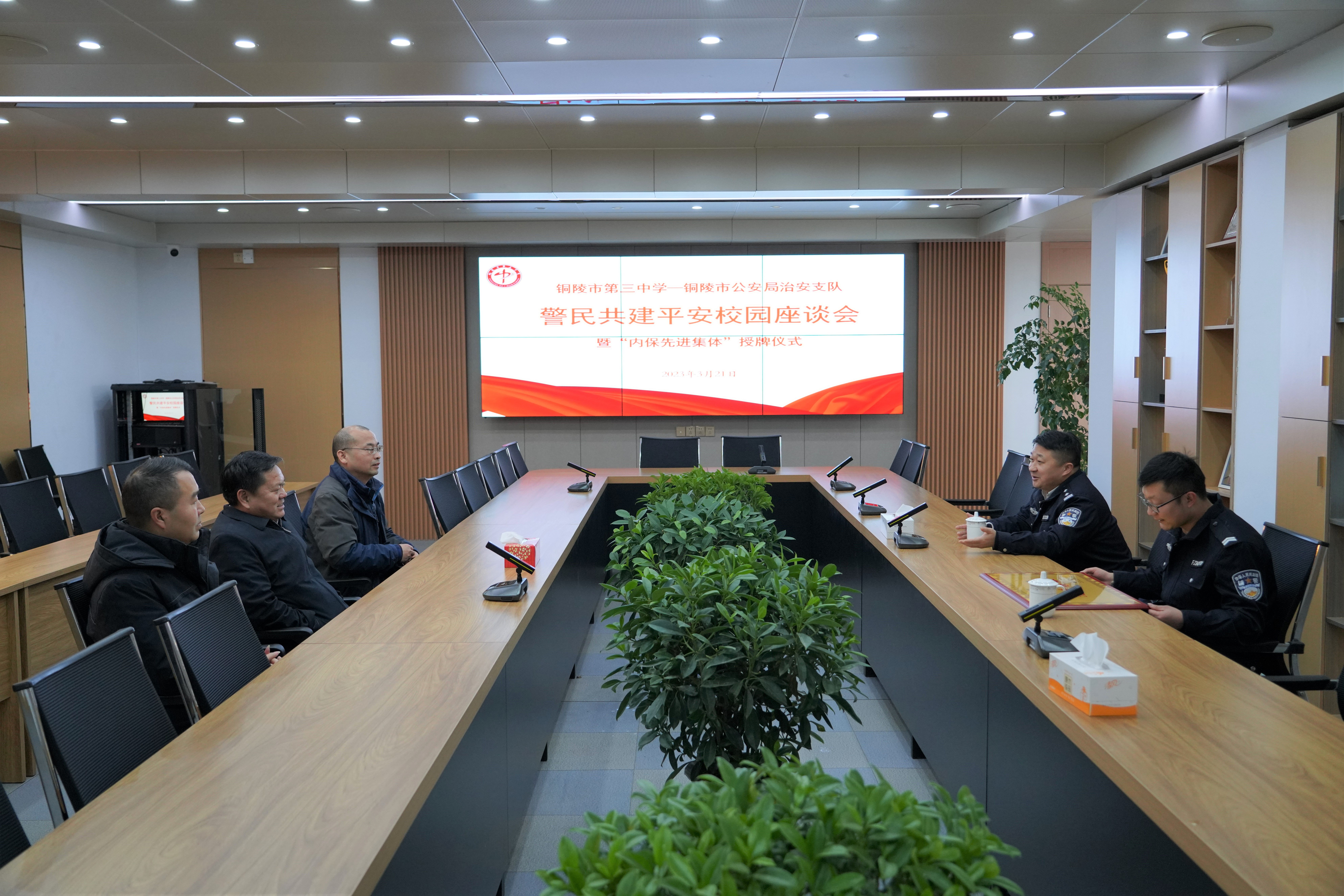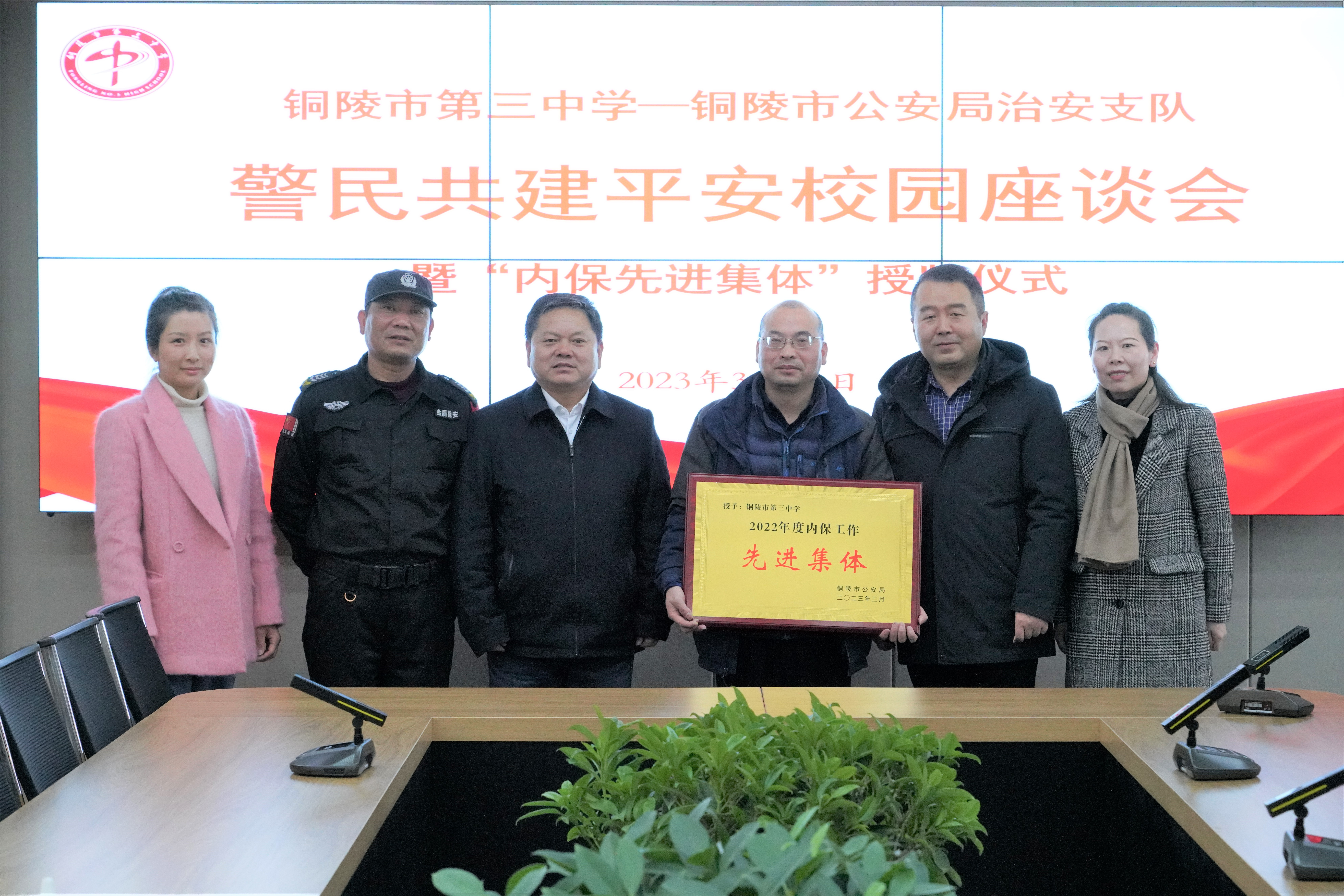 为进一步加强警校合作交流,2023年3月21日上午,铜陵市第三中学与铜陵市公安局治安支队警民共建平安校园座谈暨“内保系统先进集体”表彰会在我校行政楼五楼会议室召开。铜陵市公安局治安支队一大队教导员叶丁惠,铜陵市第三中学党委副书记、副校长王合进,党委委员、副校长章学标,校安卫科乔红胜、胡晓玲、姚清秀等参加座谈会。