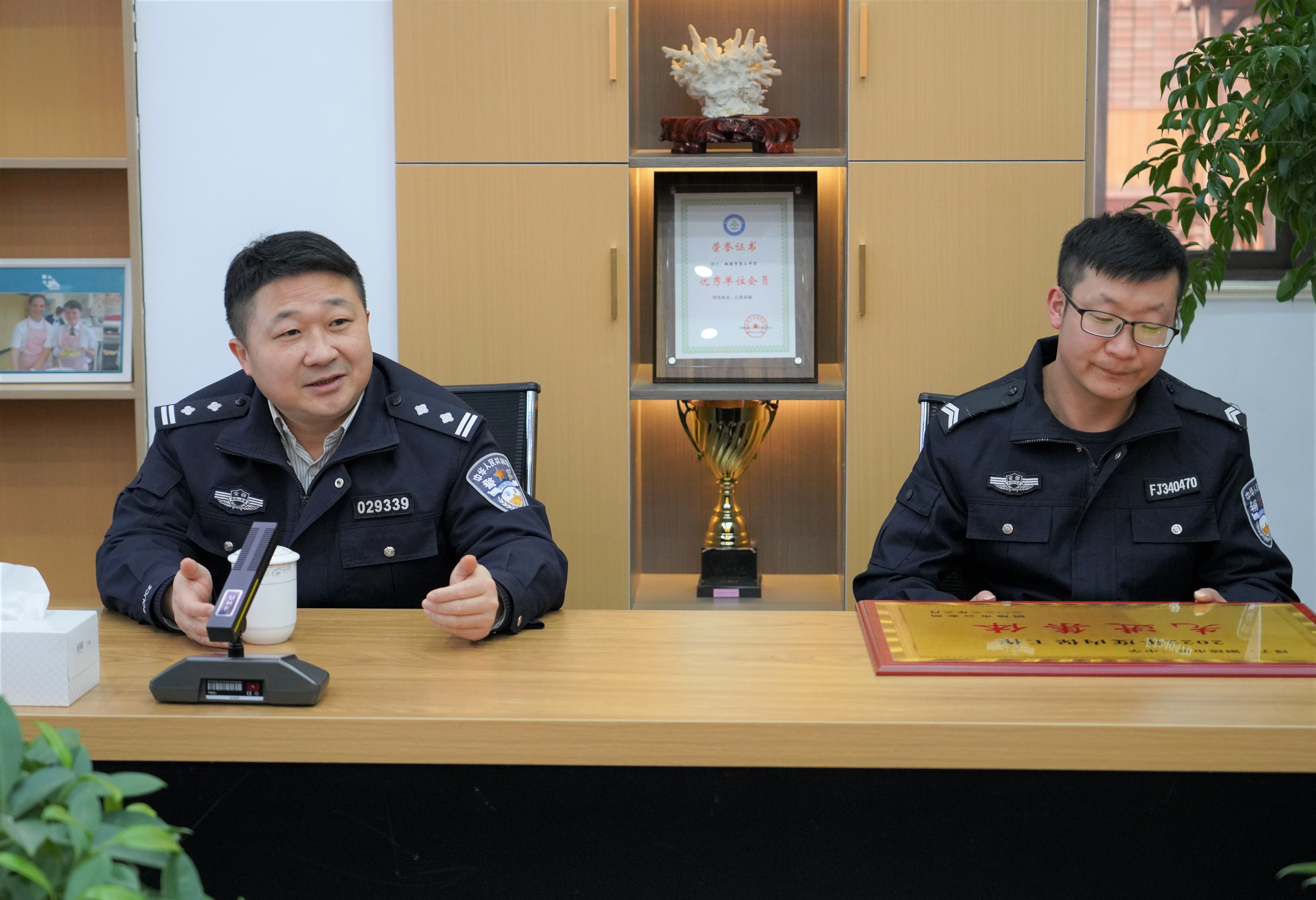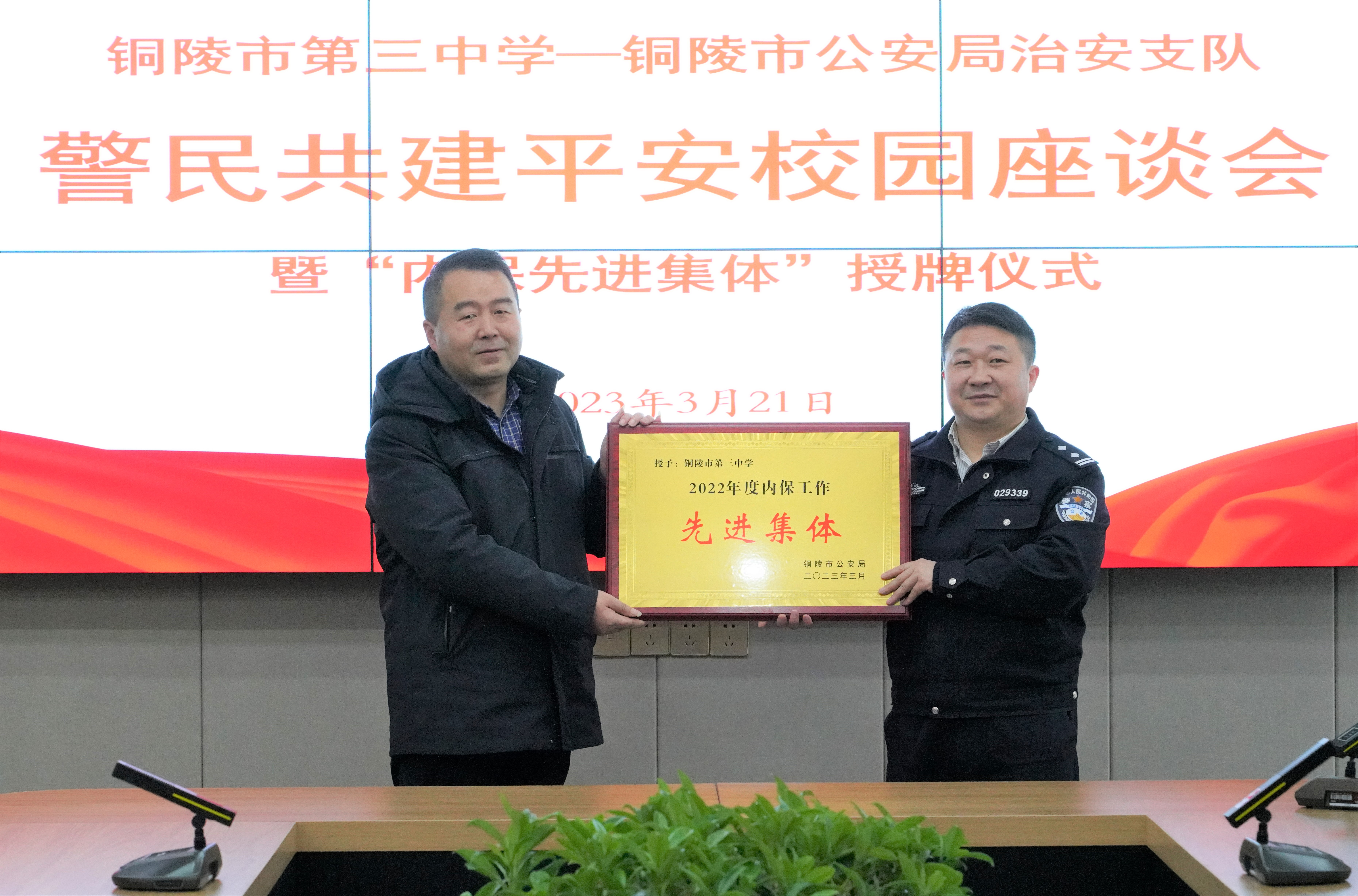 座谈会后,叶教导员代表铜陵市公安局向我校颁发了全市内保系统先进集体的奖牌。本次我校获得铜陵市公安局授予的2022年度全市内保系统先进集体。
