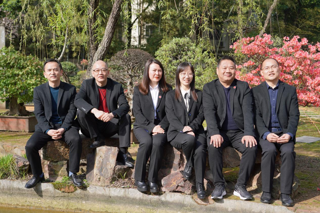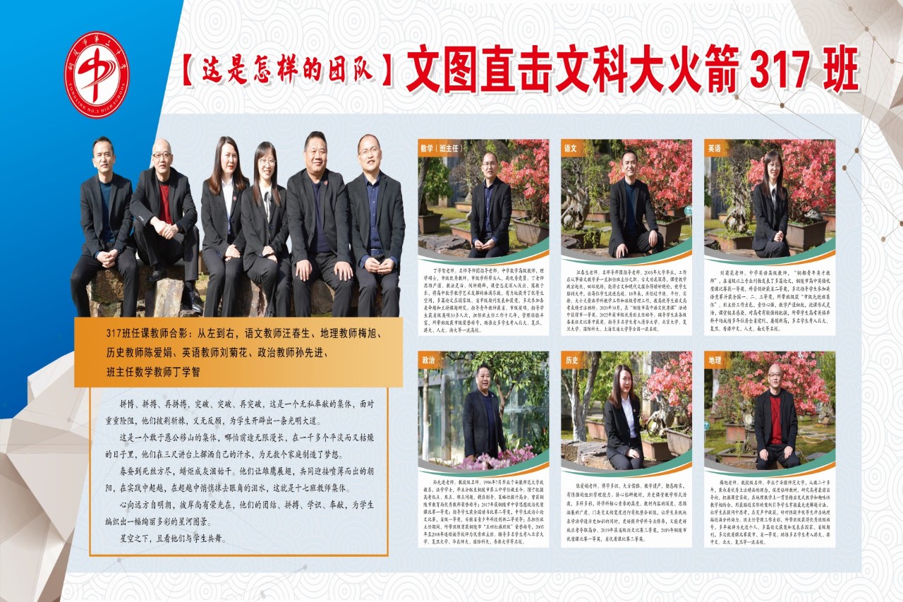 317班任课教师合影:从左到右,语文教师汪春生、地理教师梅旭、历史教师陈爱娟、英语教师刘菊花、政治教师孙先进、班主任数学教师丁学智