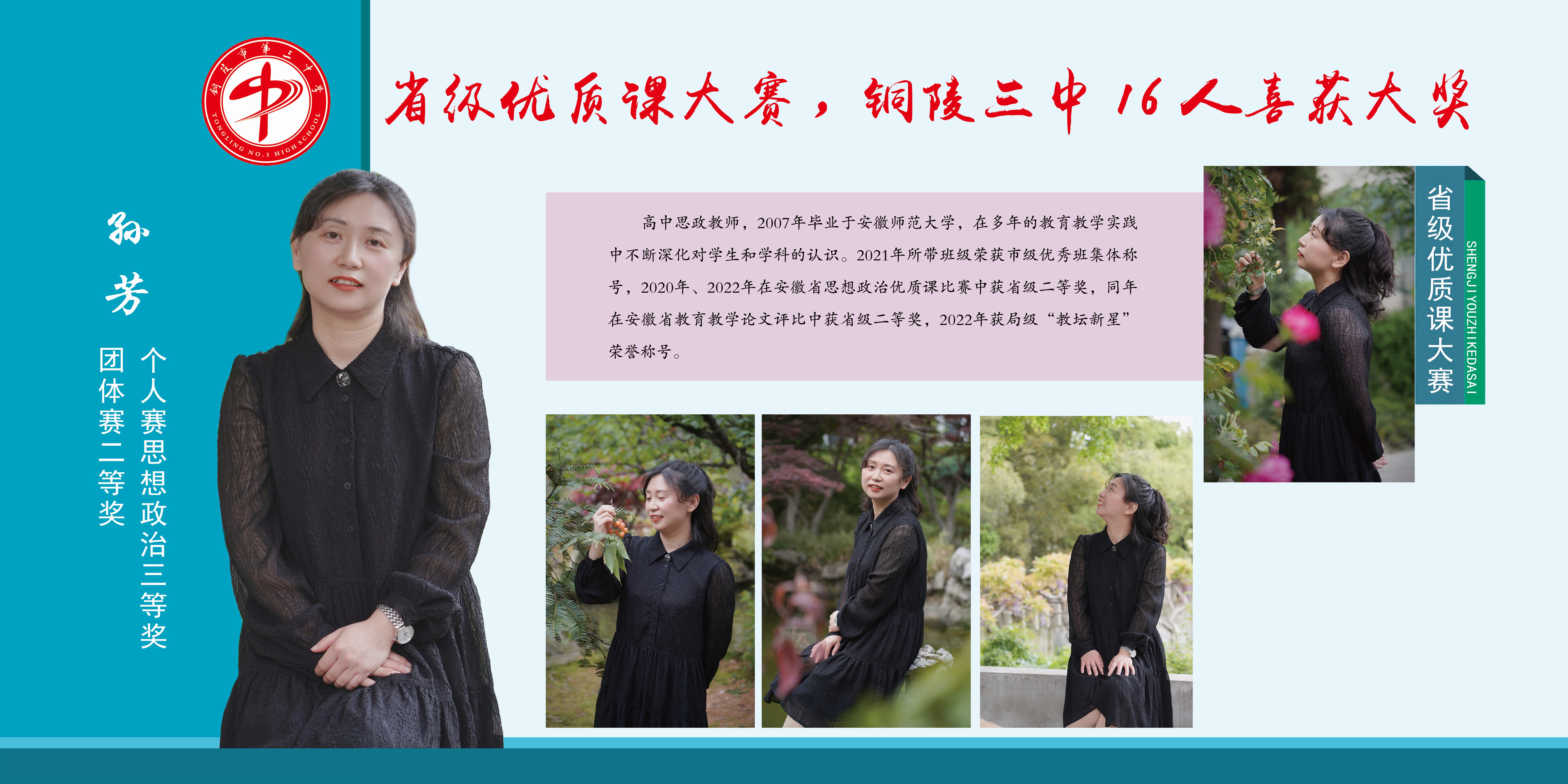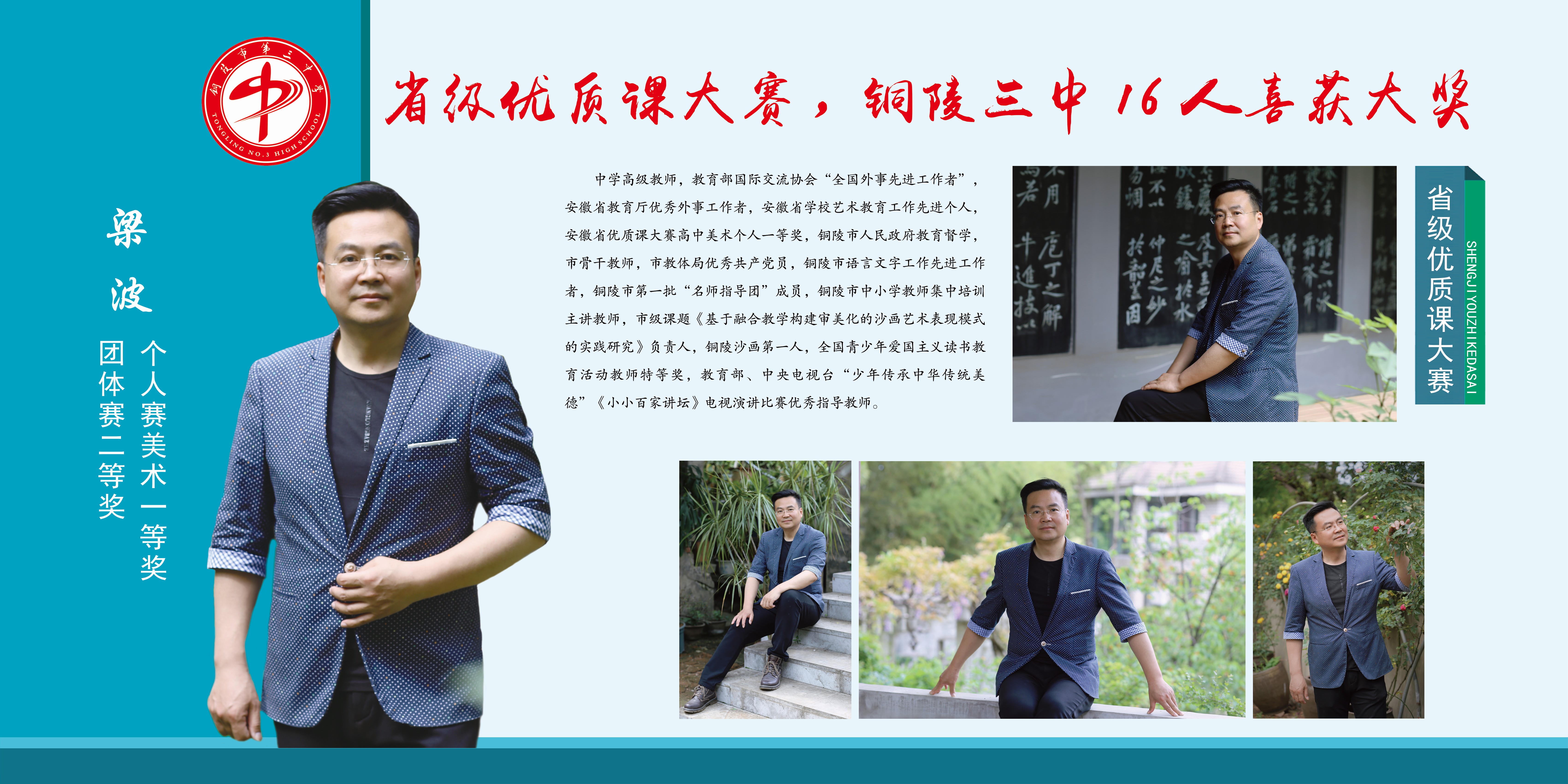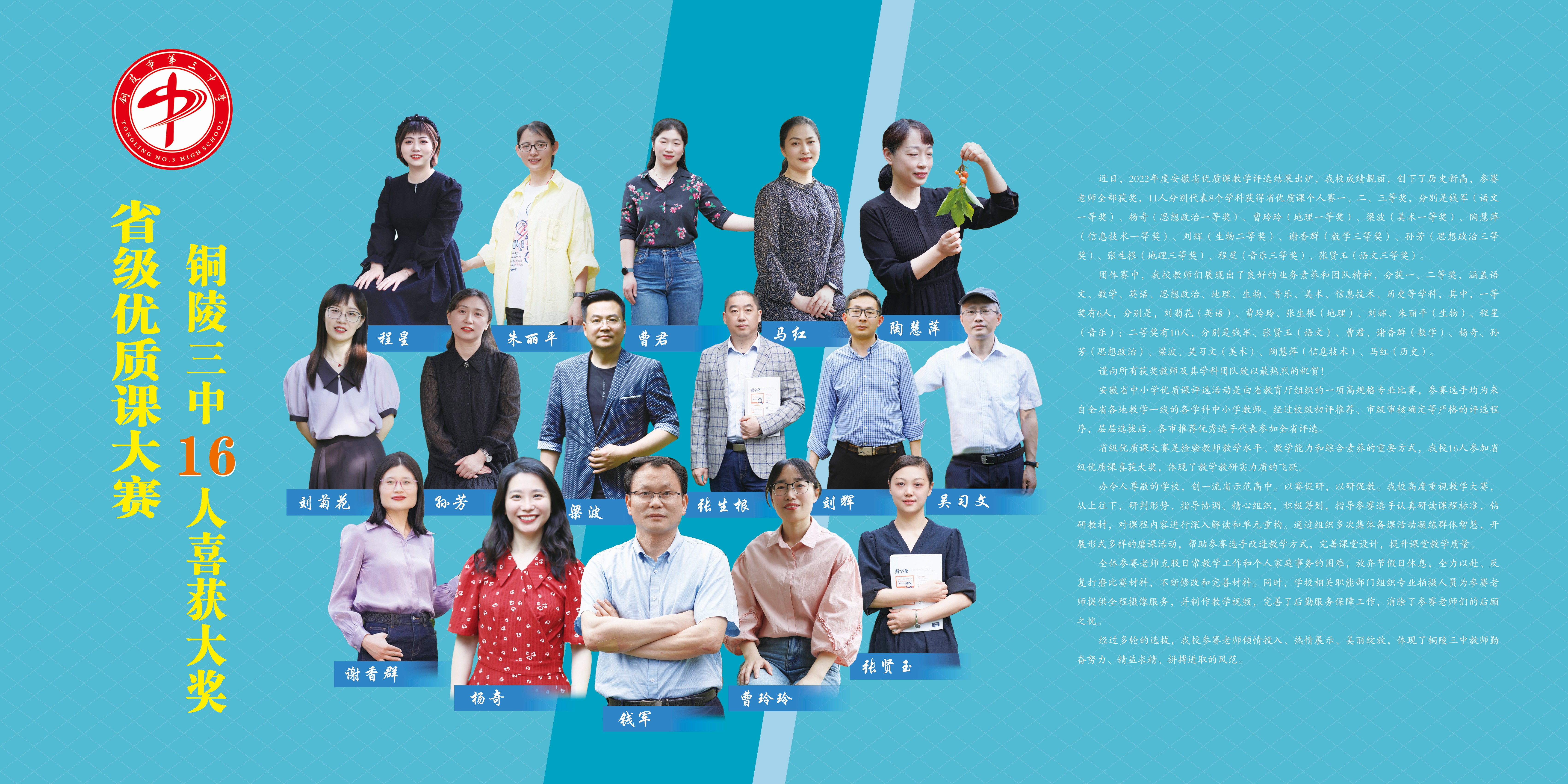 近日,2022年度安徽省优质课教学评选结果出炉,我校成绩靓丽,创下了历史新高,参赛老师全部获奖,11人分别代表8个学科获得省优质课个人赛一、二、三等奖,分别是钱军(语文一等奖)、杨奇(思想政治一等奖)、曹玲玲(地理一等奖)、梁波(美术一等奖)、陶慧萍(信息技术一等奖)、刘辉(生物二等奖)、谢香群(数学三等奖)、孙芳(思想政治三等奖)、张生根(地理三等奖)、程星(音乐三等奖)、张贤玉(语文三等奖)。