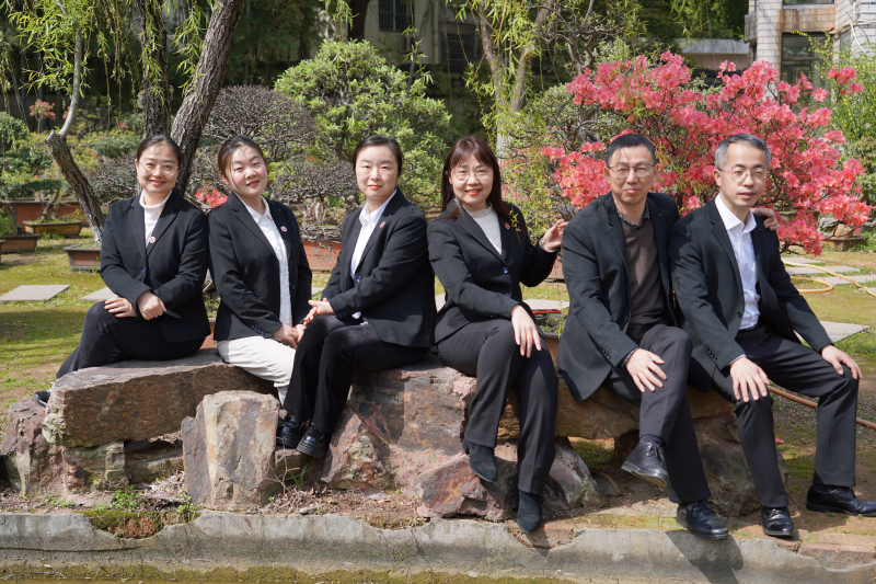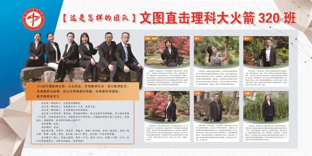 320班任课教师合影:从左到右,生物教师刘洁、语文教师阮芳、英语教师王丽娟、班主任物理教师胡晨、化学教师燕国松、数学教师余学文